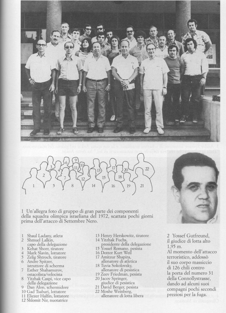 Dopo aver scavalcato il recinto con l’aiuto di un gruppo di atleti americani cheli scambiano per colleghi che come loro hanno fatto le ore piccole, gli otto terroristi si dirigono nel cuore del villaggio olimpico dove è ospitata la delegazione israeliana. Dopo aver messo Jamal di guardia, gli altri sette uomini tentano di entrare nell’appartamento n. 1 dove sono alloggiati Amitzur Shapira, preparatore atletico; Kehat Shorr, allenatore dei tiratori olimpici; Andre Spitzer, istruttore di scherma; il già citato Tuvia Sokolovsky; Jacov Springer, giudice di pesistica; Moshe Weinberg, allenatore di lotta libera e Yossef Gutfreund, giudice di lotta.