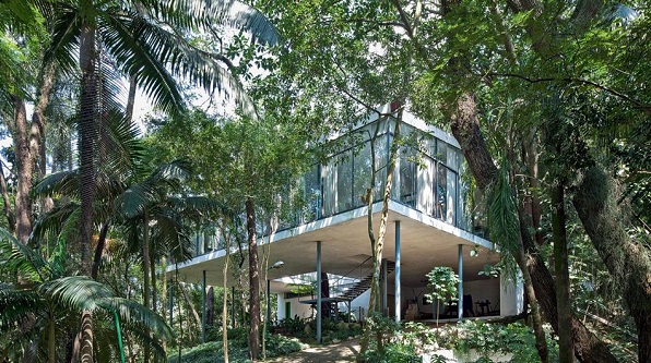La zona–giorno della casa poggia su colonne pilotis, che permettono al paesaggio di scorrere sotto l’edificio. Grandi pannelli di vetro, rendono la maggior parte della casa quasi completamente aperta sulla natura.