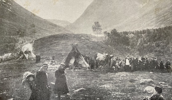 Nei pressi di Tromsø, con una breve deviazione il gruppo dei croceristi decide di «fare una capatina» al campo Sami, quasi si trattasse di una visita obbligata ma non particolarmente interessante. Si tratta probabilmente del luogo che già altre viaggiatrici e viaggiatori hanno visitato (da Léonie d’Aunet a Paolo Mantegazza, a Giulia Kapp Salvini), quasi una tappa d’obbligo per il turismo scandinavo. Lombardo descrive rapidamente l’habitat di questa specie inferiore di umanità: misere capanne accanto al recinto delle renne, unica loro risorsa sia per il cibo che per il vestiario che per l’arredamento: «Ne abbiamo trovati un centinaio, uomini, donne e bambini seduti per terra, in abito da festa per l’occasione quasi puliti, con intorno la loro mercanzia […] più o meno autentici […] opportunamente avvertiti, indossavano il costume e andavano al campo abbandonato a sciorinare al turista in cerca di sensazioni un po’ di colore locale». Nemmeno il loro costume desta troppo interesse: berretto rosso bordato di pelo di renna; pelle di renna per scarpe e stivali; culla, ninnoli, pianelle vengono elencati sommariamente come «aggeggi» vari. Perfino le renne, nel recinto vicino «piccolo, sporchissimo», sono «spelacchiate e brutte».