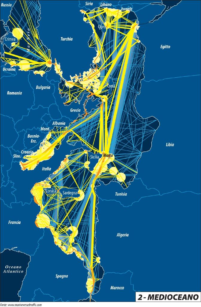 Sotto il livello del mare, le sue acque sono attraversate da sottomarini – alcuni a propulsione nucleare – di vari Stati. Nel suo fondale sono ancorati moltissimi cavi Internet di cruciale importanza a livello globale. Due gli snodi fondamentali delle nervature della Rete: Sicilia ed Egitto». Malta è lo Stato meno «mediterraneo» di tutti. E citando Simenon, Canali riporta questa frase, tratta da Il Mediterraneo in barca: «Oggi, nel bel mezzo del Mediterraneo, c’è un’isola dove si parla una lingua che non affonda le radici nelle sue coste, dove si gioca a giochi sconosciuti che si chiamano golf e bridge, e dove si mangia scatolame venuto dal Nord».