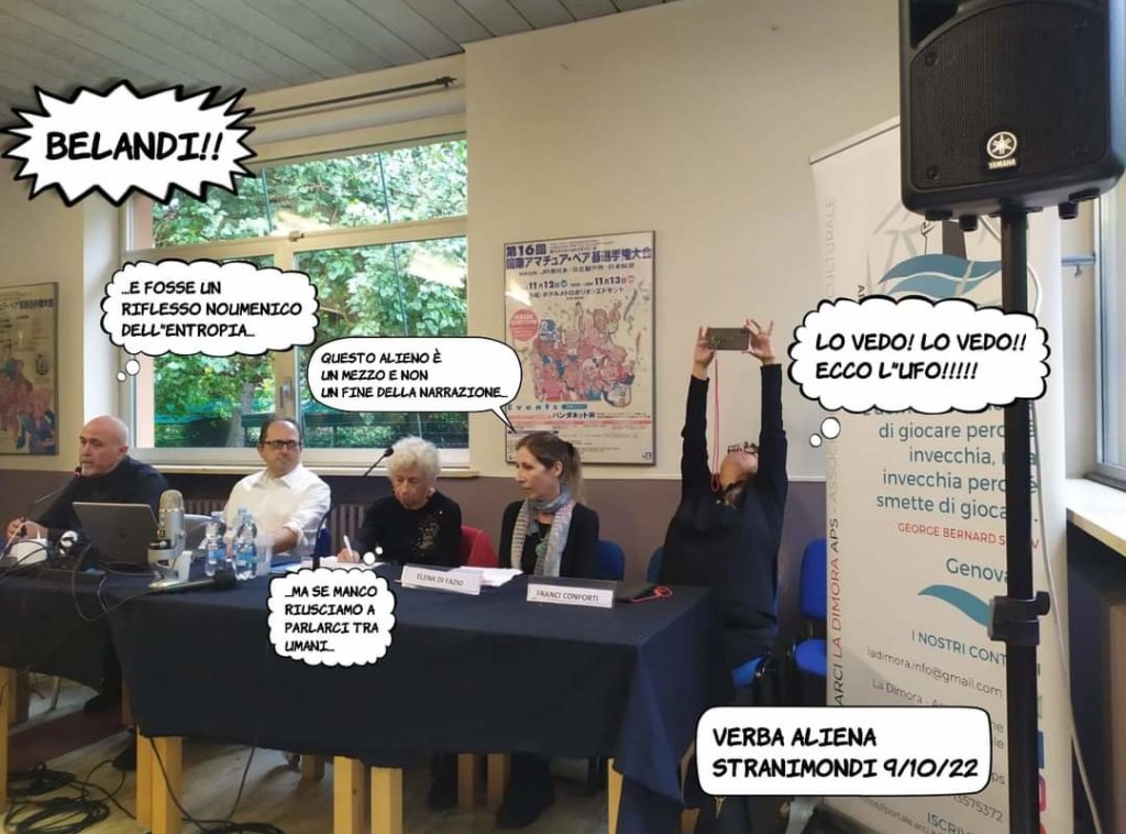 Chi frequenta la letteratura di immaginazione, sa bene, del resto, che parlare del futuro significa affrontare il presente, così come «il rapporto con l’alieno è metafora del complesso rapporto tra umani»: questa la sintesi di Giovanna Repetto in Verba aliena, confronto a più voci (tra le altre, Franci Conforti ed Elena Di Fazio) sul tema della comunicazione con l’alienità radicale, con il suo portato di insegnamento e trasformazione. Una complessità che si scioglie a Stranimondi: «Per me è come ritrovare una famiglia. Ogni volta che arrivo qua, entro in via Sant’Uguzzone e vedo questo cancello, ogni volta mi batte il cuore quasi come a un incontro d’amore – dichiara la scrittrice, che con il romanzo L’arte di non muoversi ha vinto quest’anno il Premio Odissea − Sì, perché per me significa entrare non solo in un ambiente che è quello degli scrittori di fantascienza, ma entrare in un gruppo di amici, in qualche modo, di persone che condividono una passione, cosa che invece in altri ambiti della letteratura penso che sia difficile trovare. Quando io ho cominciato a frequentare Stranimondi, mi si è aperto… un mondo! È un ambiente in cui c’è relazione tra le persone, c’è collaborazione, poi magari ci sono anche delle rivalità, però… le persone sono coinvolte le une con le altre, non c’è indifferenza, non c’è distacco, siamo immersi in una collettività, e questo mi piace molto! Al di là dell’aspetto affettivo, c’è poi anche l’aspetto dell’interesse, dello scambio di idee, dello stimolo reciproco».