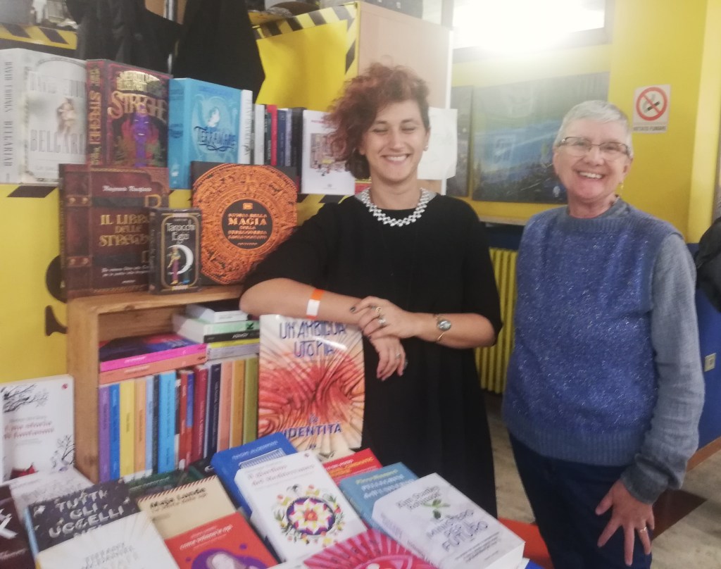 Accanto ad Angelica c’è Elisa Franco, presenza discreta per una narratrice di tutto rispetto: «Ho scritto qualche racconto di fantascienza, ma da poco, anche se la fantascienza mi era arrivata da mio padre quando avevo tredici anni, però scrivo da poco e mi ci sto divertendo molto, naturalmente» − (a beneficio di chi legge, va ricordato che con Lo stato gassoso dei fantasmi Elisa ha vinto il Premio Urania Short 2021) − Adoro l’atmosfera che si respira qui: un po’ perché, devo dire, mi accorgo che non sono la sola che non è più giovanissima ad amare la fantascienza, però ci sono anche tanti giovani, e questo mi fa altrettanto piacere perché credevo che anche quel lato fosse azzerato. E poi tutti questi libri di fantascienza, nuovi e vecchi, potrei impazzire… questa mattina ne ho comperata una carrettata che non so come porterò fino a casa… è meraviglioso. Poi è chiaro, alcune sono cose magnifiche, alcune vabbè… Però conosco sempre cose nuove, e questo è il bello della fantascienza, e qui si sente e si tocca: cose nuove!».