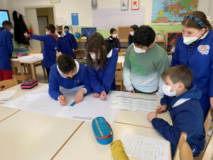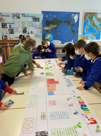 Ognuno aveva il compito di ricostruire un segmento della biografia e di intrecciarlo alla linea del tempo generale. Durante la terza e ultima fase, i bambini e le bambine hanno realizzato l’elaborato grafico unendo i quattro segmenti che hanno dato vita a un’unica linea del tempo.