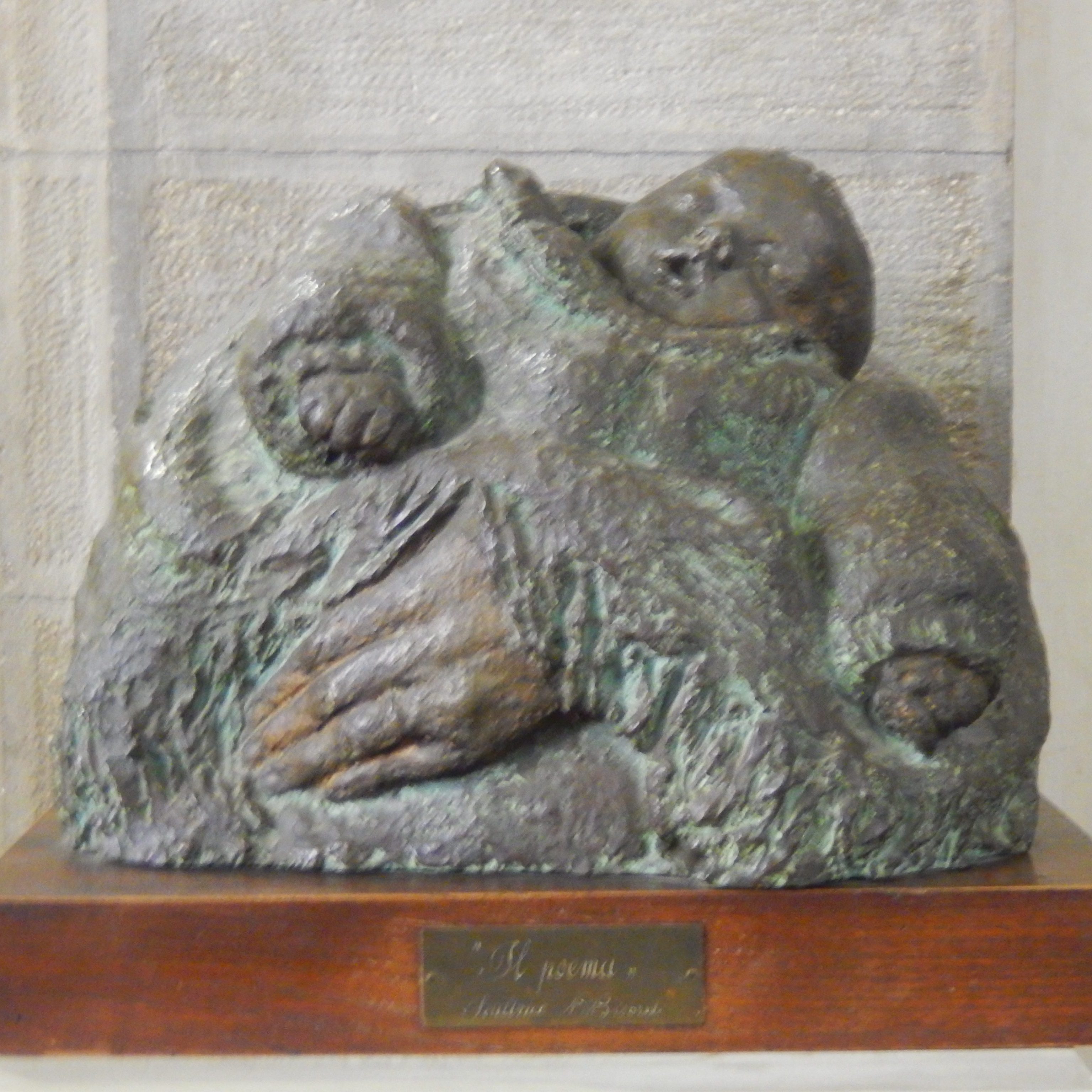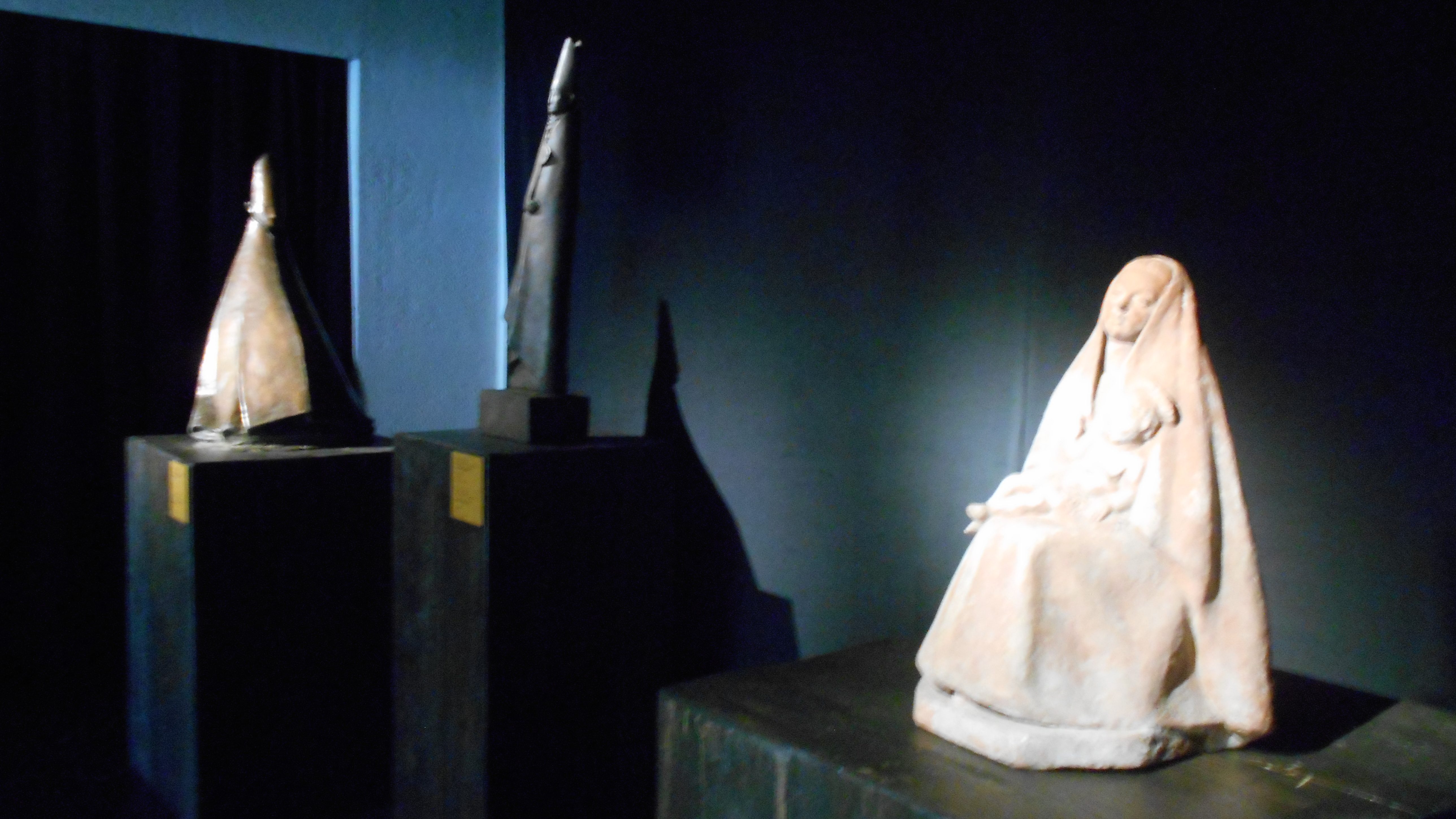 Il titolo della mostra di cui stiamo parlando, Bice guarda Manzù, merita una spiegazione: qui sono infatti esposte due statue di Giacomo Manzù (1908-1991), insigne scultore bergamasco, ma anche poeta, scenografo e costumista, contemporaneo di Bisordi. Una collezione privata custodiva due dei suoi famosi Cardinali, di cui altri esemplari in bronzo, legno, alabastro sono nei più importanti musei del mondo (Los Angeles,Venezia, Roma, ecc…) e li troviamo insieme, in un suggestivo locale quasi buio, faccia a faccia con una Madonna con bambino di Bisordi, accomunati dalla medesima verticalità e dalla struttura piramidale, ma diversi nello stile: il maestro predilige le linee essenziali e geometriche, mentre Bisordi tratteggia nel dettaglio i volti, le espressioni, i panneggi. A chi visita la mostra viene spiegato il singolare legame fra i due artisti perché è stato ritrovato un libretto dedicato alle sculture di Manzù che Bice aveva ripetutamente letto, sottolineato, studiato, manifestando esplicitamente il suo interesse, forse anche per il richiamo alla fede e alla comune spiritualità. Un’opportunità, quella del confronto, veramente preziosa e rara.