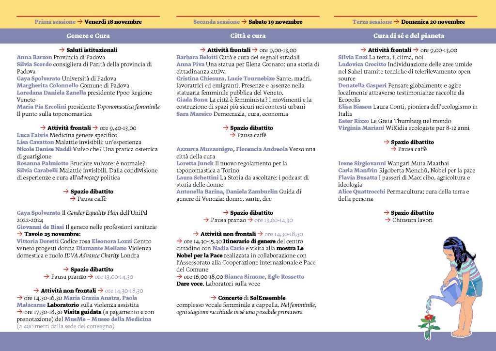 Filo conduttore, come ha illustrato l’organizzatrice Nadia Cario, è stato il tema della cura svolto secondo varie declinazioni: Genere e cura nella prima giornata, Città e cura nella seconda, Cura del Pianeta nella terza, prevedendo incontri frontali nel corso della mattina e laboratori con visite guidate nel pomeriggio. Il Convegno si è avvalso del Patrocinio della Provincia di Padova, della Consigliera di Parità della Provincia di Padova, del Comune di Padova, dell’Università di Padova, del Dipartimento DISSGEA dell’Università di Padova, della Commissione Pari Opportunità donna uomo della Regione del Veneto, del MusMe, dell’Ordine Fno TSRM e PSTRP, del Centro Veneto Progetti Donna, della SIS–Società Italiana delle Storiche e della Rete al Femminile.