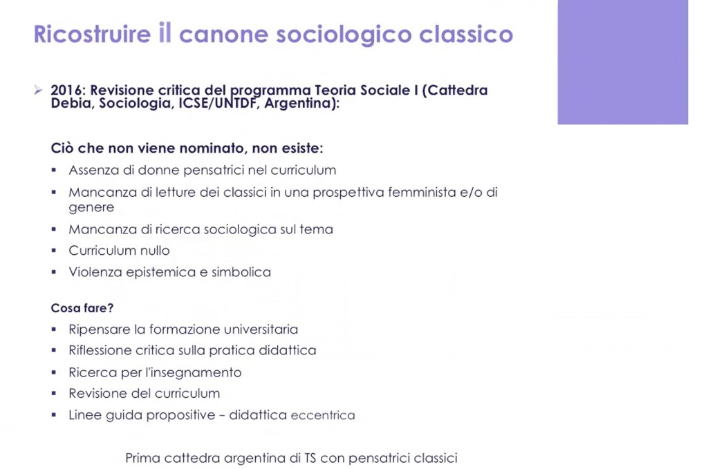 Dal 2020 si sono avviati collegamenti con altri gruppi di ricerca sia in Spagna che in Argentina, consolidando la necessità di conoscere meglio la questione della presenza delle studiose nella Sociologia classica. Analizzando i programmi di tutte le cattedre argentine di Sociologia, la dottoranda si è resa conto che la teoria sociologica non aveva programmi trattati con uno sguardo né femminista né di genere, praticamente con nessuna sociologa al loro interno. La ricerca ha evidenziato come vi sia mancanza di lettura dei classici con una prospettiva femminista, ossia si insegnano sociologi, perché prevalenti, ma vien meno inoltre una lettura femminista dei tanti testi di questi autori, con la necessità di sottolineare come la questione femminile e i problemi che le pensatrici hanno sollevato nel tempo, non trovano spazio e riflessione negli scritti maschili. Debia afferma che la mancanza di tutto questo corrisponde a un curriculum nullo, da leggersi come violenza simbolica, perché il problema non è solo la mancanza delle pensatrici, ma anche di tutti i problemi sociali che hanno studiato e su cui hanno ricercato. Il tentativo fatto, che si può definire “didattica eccentrica”, è stato mettere nel programma le pensatrici ma non come una forma di “quote femminili”, bensì come un dialogo fra esse e gli autori classici.