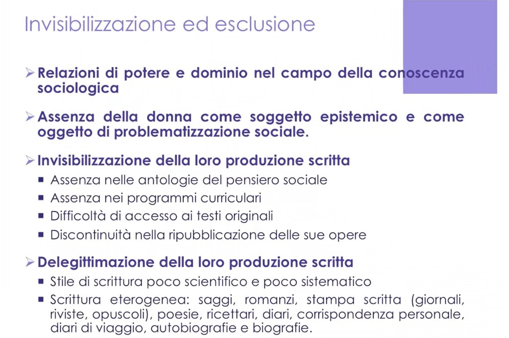 Marta Visioli, dottoranda in Sociologia, Organizzazioni, Culture, conduce la successiva discussione, occasione di scambio di esperienze e considerazioni utili per la ricerca dell’allargamento del canone sociologico. Dei diversi interventi, ricordiamo qui quello della dottoranda Sumaya Abdel Qader, che ringrazia per il seminario, tappa necessaria e importante per portare una nuova prospettiva negli studi sociologici; ma non solo, questo è considerato un tema importante perché la scarsa presenza di scienziate nei programmi ufficiali è trasversale a tutte le discipline e gli ambiti di studio esistenti, tra cui anche quello biologico, da cui lei proviene. Tante colleghe e colleghi, poi, provenienti dal mondo arabo, si sentono esclusi dalla considerazione per un contributo che possono portare anche persone di altri Paesi, donne in particolar modo, ma non solo, quindi aggiunge il tema intersezionale di cui tener conto. Se noi chiediamo un nome, afferma, di una sociologa araba, indiana o cinese, non viene in mente nulla alla maggior parte delle persone, forse in Italia è famosa Fatima Mernissi, ma più per il suo contributo divulgativo di romanzi che per il suo contributo sociologico, quindi ancor più è apprezzabile questo lavoro che cerca di mettere in connessione ricercatrici e studiose, per ampliare lo sguardo del contributo scientifico sì alle donne, ma anche alle donne provenienti da altri Paesi. Conclude dicendo di credere molto nell’importanza dell’interconnessione per ricostruire un ampio quadro di quello che esiste, perché il tema del lavoro invisibile delle donne è trasversale a tutte le discipline e a tutti i Paesi e occorre uno sforzo collettivo per andare a ritrovare e rendere disponibile il materiale di tante autrici, che hanno dato un contributo alla scienza importantissimo e non riconosciuto e diffuso.