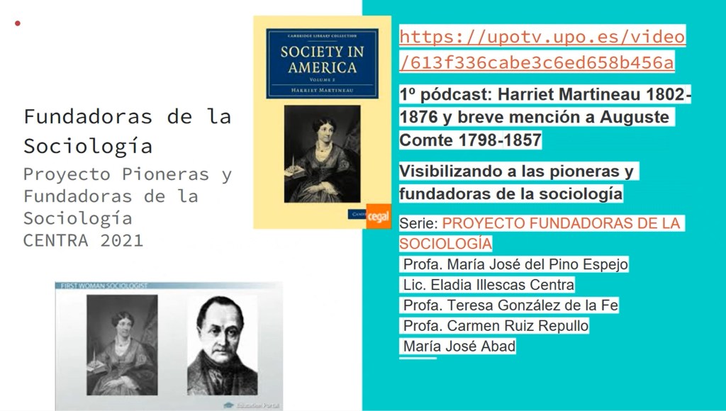 Dopo le interessanti relazioni delle docenti Rita Bichi e Maria Rocio, che potete leggere qui, il webinar Madri e padri della Sociologia. Sfide per la ricerca e la formazione sociologica è proseguito con gli interventi di Eliana Debia, dottoranda dell’Università di Buenos Aires, e di María José del Pino Espejo, docente dell’Università Pablo de Olavide di Siviglia, entrambe in collegamento da remoto.