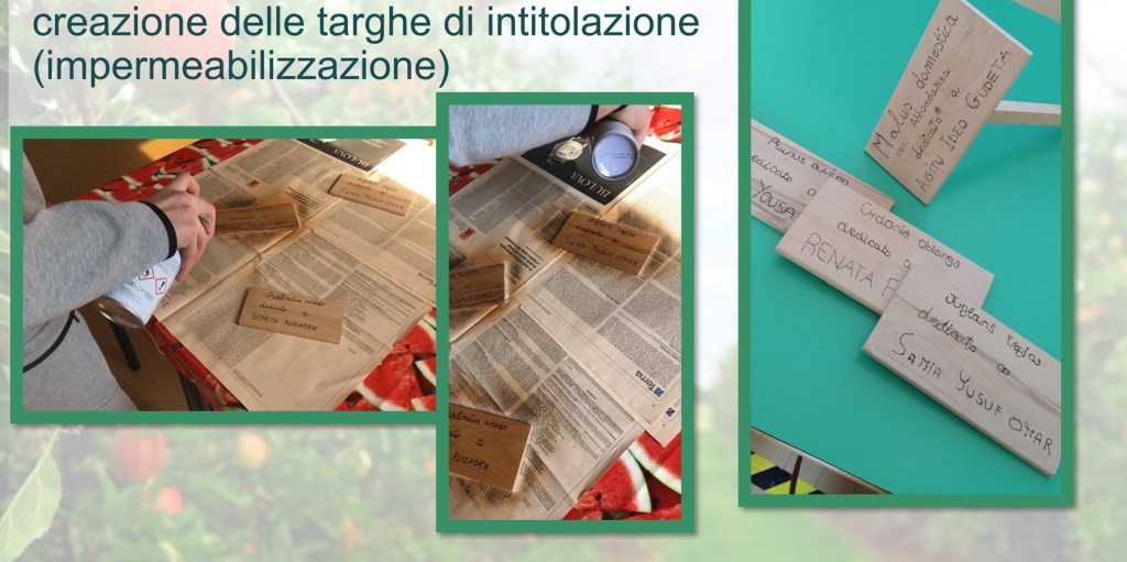 Un’ultima fase ha collegato le attività precedenti: sono state create delle tavole didattiche in cui riportare le schede botaniche delle piante da frutto associate alla donna da ricordare, e in seguito sono state plastificate. Poi alunne e alunni hanno creato le targhe di intitolazione, una per ogni pianta. Su ogni targa è stato scritto il nome botanico dell’albero e la donna a cui è dedicato. Le targhe sono state completamente costruite dalle ragazze e dai ragazzi: con il pirografo hanno scritto sulle tavolette di legno, protette con vernice impermeabile perché non possano essere rovinate dagli agenti atmosferici.