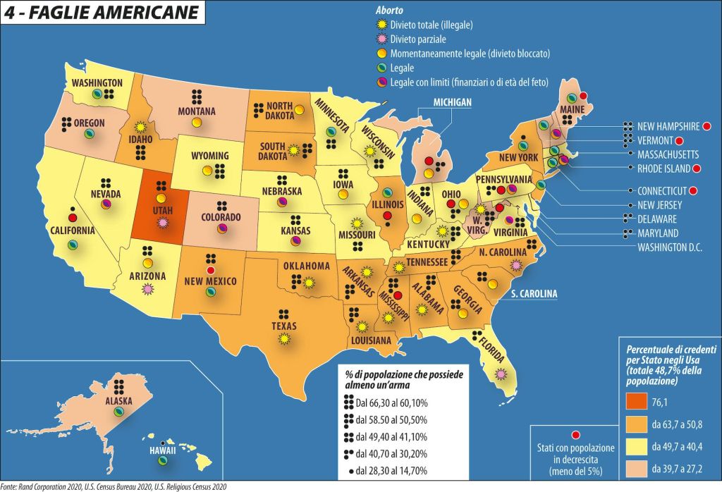 Ricco, articolato e documentatissimo su questo punto è il saggio, Fiamme sulla collina. L’America in crisi assedia sé stessa di Federico Petroni, che ha anche curato questo numero della rivista. La crisi di identità americana è uno dei fenomeni meno comprensibili e più ignorati dei nostri tempi. L’ha intercettata Putin, che si è sentito libero di iniziare «l’operazione di denazificazione dell’Ucraina», ma a cui non pare essere andata molto bene. «È in corso una lotta all’interno del ceppo bianco dominante per ridefinire il canone nazionale, cioè chi è americano e che cosa vuole dire esserlo. È in ballo il rapporto tra governo federale e Stati federati, che pretendono più potere e di smantellare lo Stato amministrativo […] Le élite sono sempre più distanti e inaccessibili al resto della popolazione, da queste disprezzato. Crolla la fiducia nelle istituzioni centrali, inadatte a gestire l’aumento della complessità». Fin dal 1991 il sociologo David Davison Hunter ha formulato la teoria della culture war, utile a comprendere quanto sta accadendo: «la linea di faglia fondamentale tra gli americani non è etnica, di censo, ideologica o partitica; riguarda «visioni del mondo» opposte, «sistemi competitivi di comprensione morale». E visto che l’America si concepisce come mondo e come progetto morale, lo scontro verte su idee opposte d’America. «Non è impossibile parlare a qualcuno che non condivide lo stesso linguaggio morale?» Si litiga sull’aborto, sulla religione, ci si arma in modo spropositato (in America ci sono più fucili che persone e tra queste molte donne); «gli Stati sono diventati i fortini degli opposti modi di intendere la propria vita e l’America» e diventano i luoghi in cui si affermano, in contrapposizione allo Stato federale, sempre più indebolito, le diverse identità.