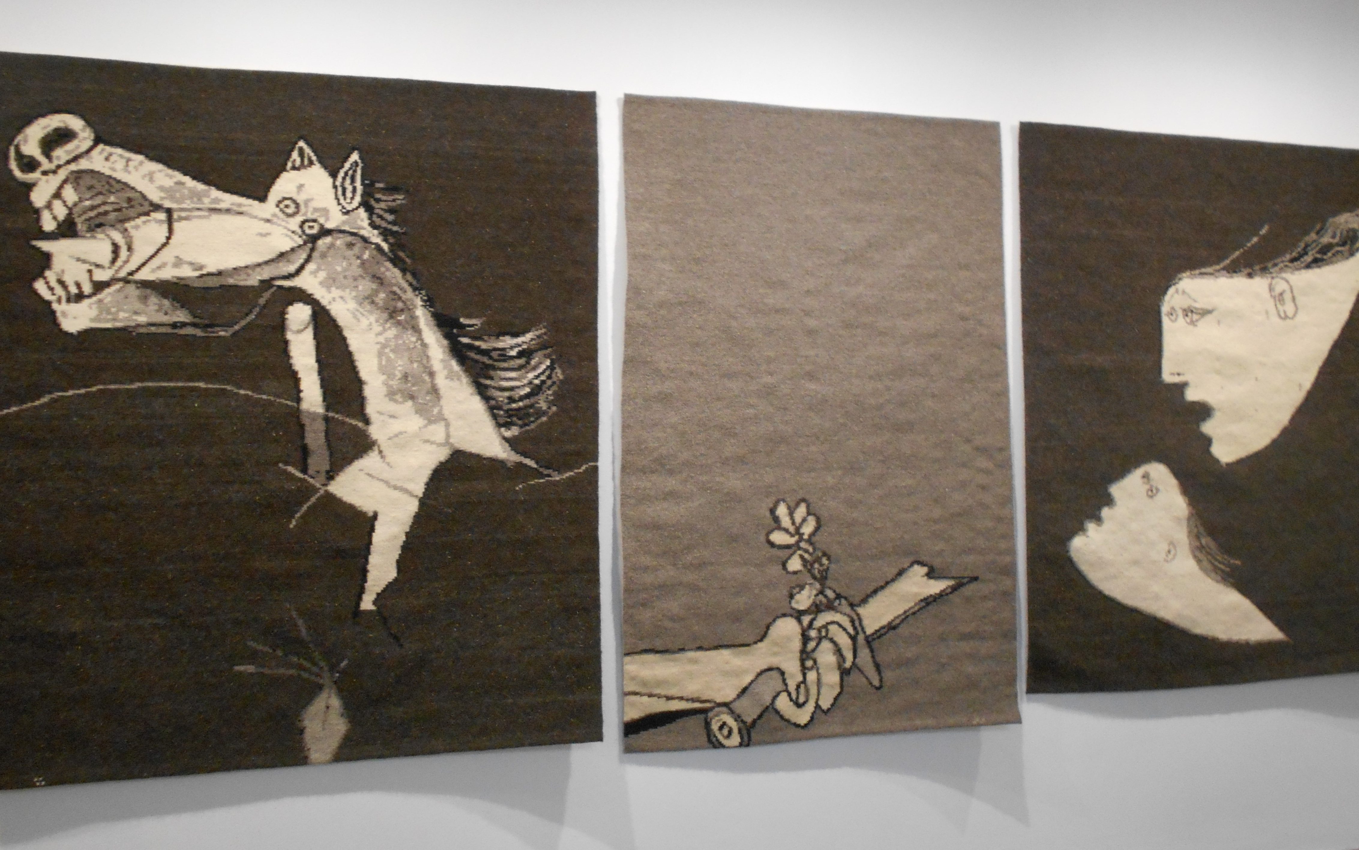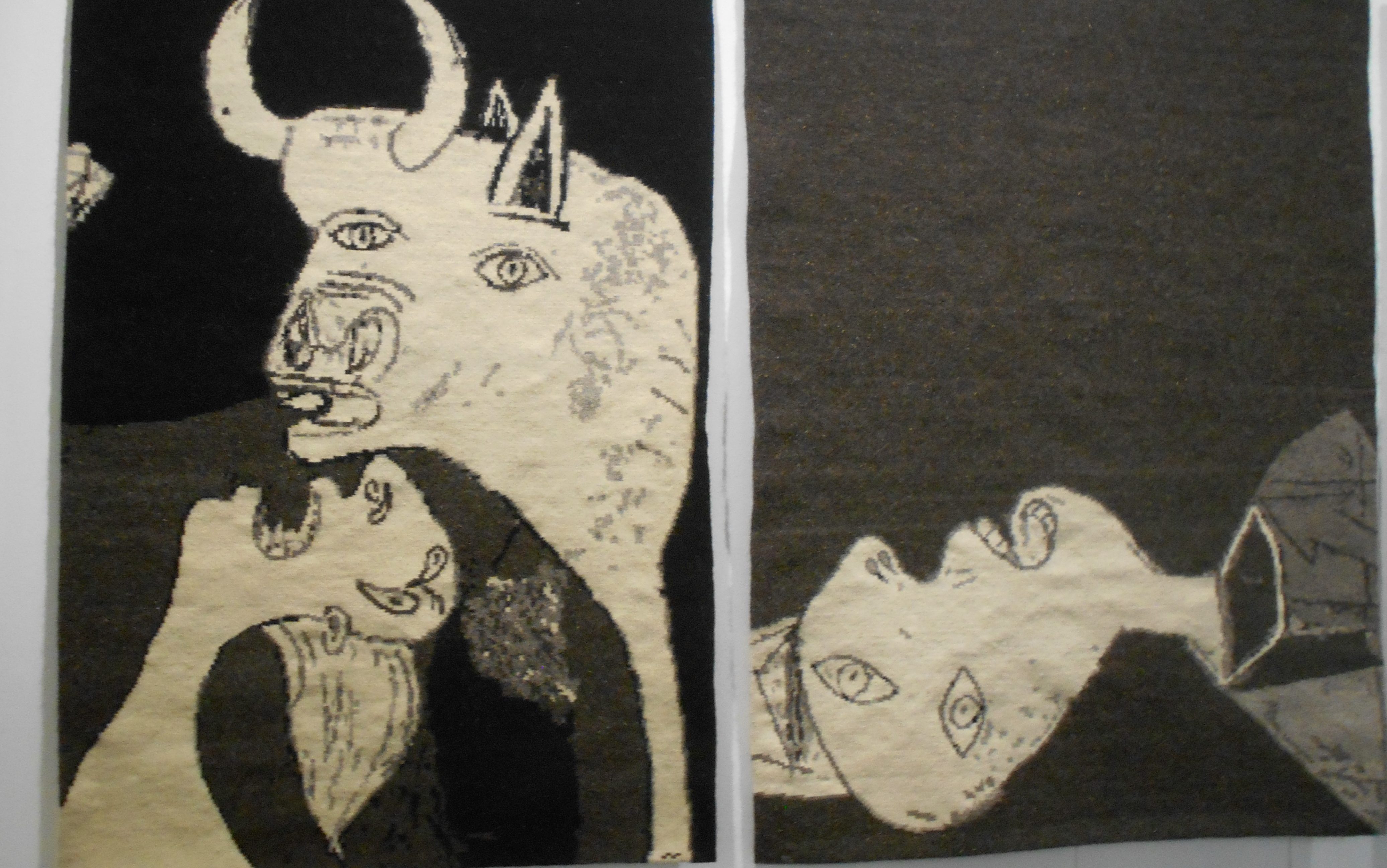 Questa volta il protagonista è Pablo Picasso (1881-1973), ma in verità non è da meno il ruolo delle donne sarde con il loro prezioso, antichissimo lavoro, come vedremo. Di Guernica e dei tragici eventi a cui fa riferimento pensiamo di sapere molto e migliaia di persone visitano ogni anno il Museo Reina Sofía di Madrid proprio per vedere da vicino l’opera e per scoprirla nei dettagli, confrontandola con altri capolavori dell’artista catalano lì esposti. Si sa pure che il dipinto, anche per le dimensioni, non viene più spostato dalla sua sede, ma è bello scoprire che siamo di fronte a un anniversario degno di celebrazione. Infatti settanta anni fa, dal 23 settembre al 31 dicembre 1953, insieme a oltre trecento opere, Guernica con i suoi quasi otto metri di ampiezza fu esposta per la prima e unica volta in Italia, nel Palazzo Reale di Milano, nella sala delle Cariatidi, dove ancora comparivano segni dei bombardamenti; proprio le tracce del recente conflitto avevano convinto l’artista ad accettare l’invito. Il Man ricorda dunque il passaggio italiano di questo capolavoro, «fondamentale per una generazione di autori e critici d’arte, ma soprattutto di cittadini la cui coscienza è ancora scossa profondamente dal valore assoluto di una immagine e dal suo messaggio eterno» (dai pannelli esplicativi presenti nelle sale, come le citazioni successive). Ma un’altra ricorrenza si affaccia: sono infatti venti anni da quando a Nuoro venne allineata in questo stesso spazio espositivo l’intera raccolta di cento incisioni di Picasso degli anni dal 1930 al ’37 dal titolo complessivo Suite Vollard. Il benvenuto al terzo piano ci viene dato dalla trascrizione del celebre dialogo fra Picasso e l’ufficiale tedesco che, davanti a Guernica, esclamò: «Avete fatto voi questo orrore, maestro?» a cui fu risposto fermamente: «No, l’avete fatto voi!». La sosta successiva consiste nella video-istallazione con la regia di Manuelle Mureddu che introduce all’opera, alla sua genesi faticosa e sofferta, alle vicende politiche e sociali che avevano formato l’uomo e il suo pensiero «invadendo ogni angolo delle sue giornate e assorbendo l’artista per giorni inesausti di passione e pittura». Ma poi appare qualcosa di miracoloso e stupefacente, illustrato da un efficace video che scava nelle fasi del lungo lavoro, sui volti assorti, sulle mani operose: davanti ai nostri occhi sono esposti sei grandissimi arazzi in scala 1:1 che riproducono fedelmente particolari significativi e simbolici del dipinto, realizzati dalla sapienza delle artigiane tessitrici della Barbagia. Un lavoro immenso, certosino, fatto a telaio verticale completamente a mano, con lana di pecora sarda; Tessere la pace. Omaggio a Guernica: un progetto grandioso ideato dallo Studio Pratha di Nuoro, con la direttrice creativa Graziella Carta e la designer Laura Lai. Ma per poter ammirare un tale risultato ci voleva tutta l’esperienza tramandata da generazioni delle maestre Lucia Piredda, Alberta Pinna, Lucia Todde, Rosaria Ladu, Gonaria Todde.