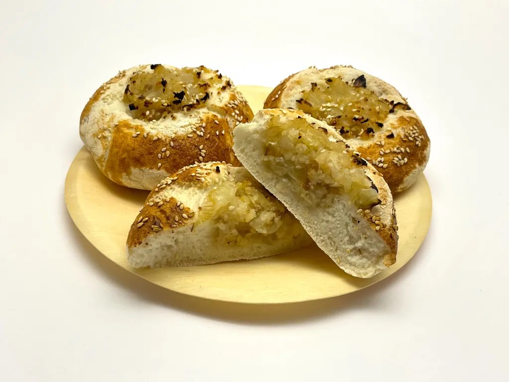 In una ciotola, va mescolata l’acqua con il lievito e il malto. Poi, va aggiunta la farina, tutta, e il sale. Mescolare per qualche minuto avendo cura, però di ottenere un impasto abbastanza grossolano. Dopodiché, bisogna trasferire tutto su una spianatoia ben infarinata e lavorare fino a che il panetto non risulti asciutto. Metterlo in una ciotola oliata, coprire e lasciar lievitare aspettando che raddoppi di volume. A lievitazione avvenuta, fare lo staglio delle forme, porle su una teglia infarinata, infarinare anche la pezzatura e far crescere, nuovamente, fino al raddoppio. A questo punto, prendere ciascuna pallina e formare al centro un incavo dove mettere cipolla stufata e una spolverata di pangrattato. Unire, a piacimento, i semi di papavero e cuocere in forno per circa dodici minuti a 220 gradi.