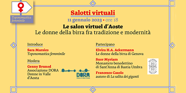 «La birra è donna». Si intitolava così un articolo del numero 180 della nostra rivista. E quanto la birra sia donna lo ha ben dimostrato il nostro primo salotto virtuale del 2023, Le salon virtuel d’Aoste, denominato in francese in omaggio alla Regione che ha dato il via ai nostri Salotti regionali, una delle tante iniziative in programma per il 2023. La sigla dei salotti regionali è cantata dalla nostra socia Kay Mc Carthy ed è un’antica ballata britannica, Geordie, a molte di noi molto cara perché l’abbiamo ascoltata dalla voce di quello che, a parere di chi scrive, è il più grande cantautore italiano, Fabrizio De Andrè, che abbiamo ricordato in apertura del nostro incontro dell’11 gennaio, anniversario della sua prematura scomparsa. Le salon virtuel d’Aoste è stato realizzato con la preziosa collaborazione dell’Associazione DORA Donne in Valle d’Aosta, nostra socia amica, con cui da due anni realizziamo progetti nelle scuole della Regione autonoma e con cui abbiamo organizzato la presentazione della nostra Mostra Le madri della Repubblica oltre al bellissimo progetto delle Pillole Ri-Costituenti, una serie di video in cui le donne che hanno partecipato alla scrittura della nostra Costituzione si raccontano in prima persona, interpretate da associate di DORA e Toponomastica femminile. Genny Brunod di DORA ha moderato l’incontro ricordando che l’associazione a cui appartiene promuove la cultura del rispetto delle donne e tra i generi e vuole valorizzare l’importanza delle donne nel mondo del lavoro. La scelta del tema di questo incontro La storia della birra tra tradizione e modernità deriva dal fatto che nella civiltà mesopotamica prima e nel Medioevo poi, con Ildegarda Von Bingen, la birra è sempre stata collegata al femminile.