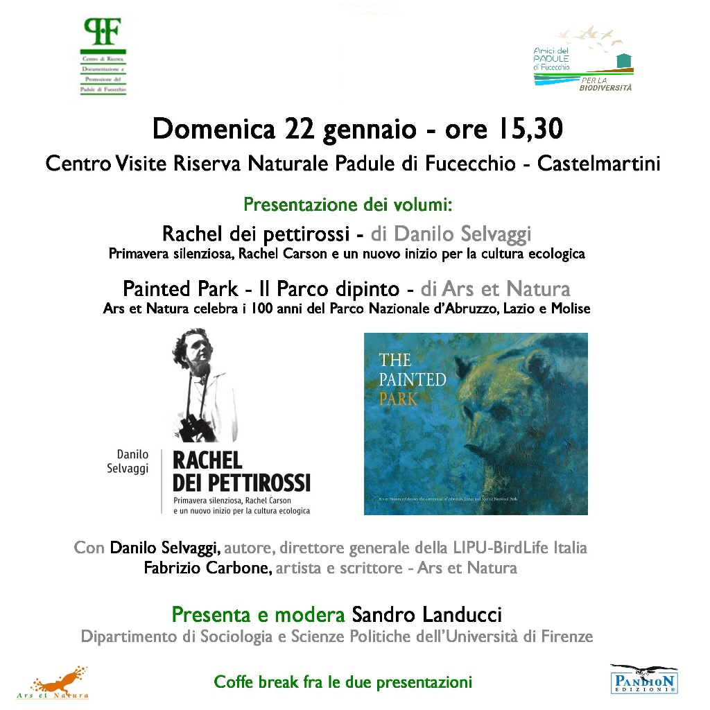 Nel corso del pomeriggio, davanti a un folto pubblico, sono stati presentati due volumi di straordinario valore: il primo è Rachel dei pettirossi, scritto dal filosofo ecologista Danilo Selvaggi, direttore generale della Lipu-BirdLife Italia, l’altro è Painted Park – Il Parco dipinto di Ars et Natura, entrambi editi da Pandion. Svolgeva funzioni di moderatore e coordinatore Sandro Landucci, docente del Dipartimento di Sociologia all’Università di Firenze; era presente anche l’editore Alessandro Troisi. La sindaca di Larciano Lisa Amidei e l’assessora all’Ambiente Sara Sostegni hanno portato il saluto dell’amministrazione comunale.
