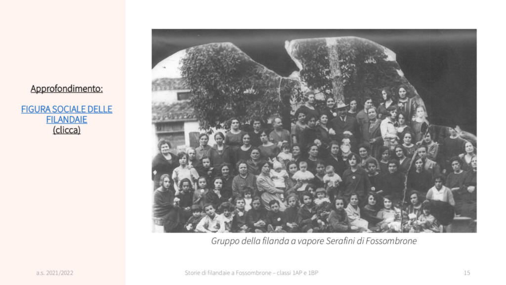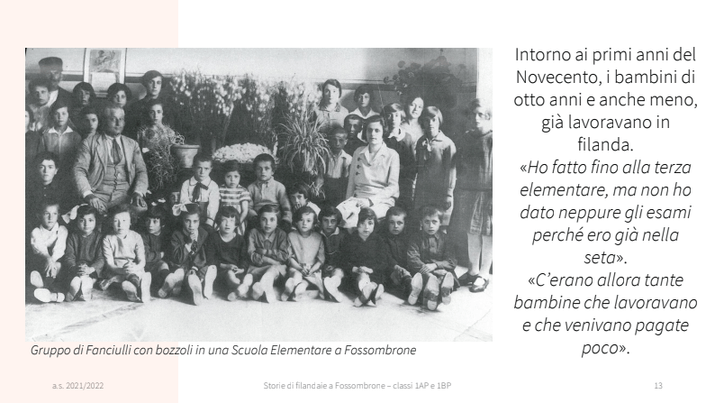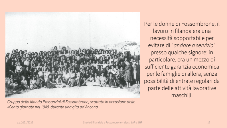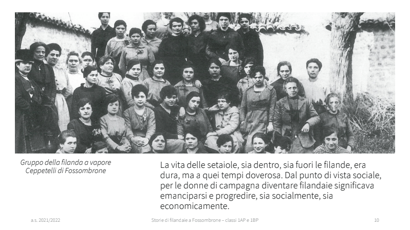 Come ha scritto Claudia Santoni in un contributo intitolato La lavorazione della seta a Tolentino e la nascita della forza lavoro femminile. Ritrovare il capo del filo (in Annalisa Cegna, Ai margini della storia. Percorsi individuali e collettivi delle donne in provincia di Macerata, Assemblea Legislativa delle Marche, 2010, pp. 97-113) l’industria della seta ha rappresentato per le Marche una delle attività più diffuse e di maggior peso del sistema manifatturiero della regione, almeno fino alla Prima guerra mondiale. Ed è proprio l’industria serica e in particolare la nascita dell’industria bacologica a giocare un ruolo fondamentale nel «canalizzare e modellare la forza lavoro locale femminile che nacque nella filanda e contribuì in modo determinante allo sviluppo sia economico che sociale» (p. 98) delle città in cui le filande sorgevano. Tutto questo emerge chiaramente nel lavoro di ricerca-azione realizzato da queste due classi prime con le loro docenti in cui l’analisi di documenti e foto del tempo ha costituito la base per lo studio approfondito di interviste rilasciate da filandaie forsempronesi. Il video e la presentazione in Power Point confezionati per il concorso lasciano trasparire la sorpresa dei ragazzi e delle ragazze nello scoprire quanto la seta prodotta a Fossombrone fosse apprezzata non solo a livello nazionale, ma anche all’estero.