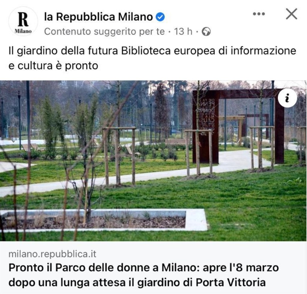 Un impegno che si rinnoverà nelle prossime settimane, in occasione della festività dell’8 marzo, con una nuova intitolazione dedicata ai diritti delle donne. Quest’ultima frase ci incuriosisce e proprio oggi, grazie alla nostra socia Giovanna Criscuolo, preziosa fonte di scoperte, apprendiamo di che si tratta: Il parco delle donne. Sarà inaugurato l’8 marzo e noi ci saremo. Grande festa! Siamo/siete tutte invitate!