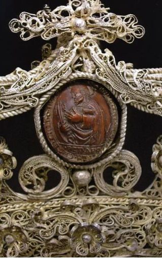 La terza opera è un singolarissimo lavoro di oreficeria, conservato al Museo Civico Medievale di Bologna: si tratta dello stemma della famiglia Grassi, un’opera in filigrana d’argento, cristallo di rocca e legno di bosso, nella quale sono incastonati undici noccioli d’albicocca intagliati con figure di santi.