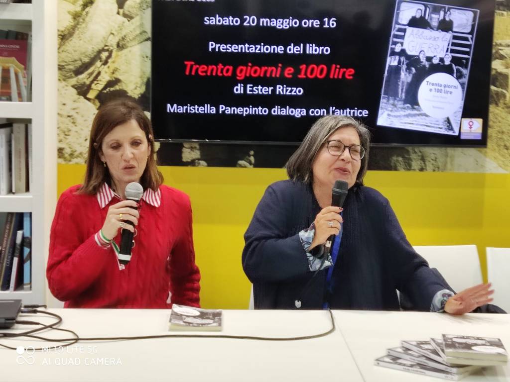 Il secondo evento è stato la presentazione, sabato 20 nello stand di Regione Sicilia, del romanzo di Ester Rizzo Trenta giorni e 100 lire, uscito quest’anno per Navarra con la bella prefazione di Rossana Florio, direttrice dell’Archivio di Stato di Agrigento. Ester, toponomasta di lunga data e coreferente di Tf per la Sicilia, ha ormai al suo attivo alcuni saggi (Camicette bianche. Oltre l’8 marzo, uscito in diverse versioni dal 2014; Le Mille. I primati delle donne, del 2016; Donne disobbedienti, 2019; Il labirinto delle perdute, 2021) e un romanzo, Le ricamatrici, tutti editi da Navarra.