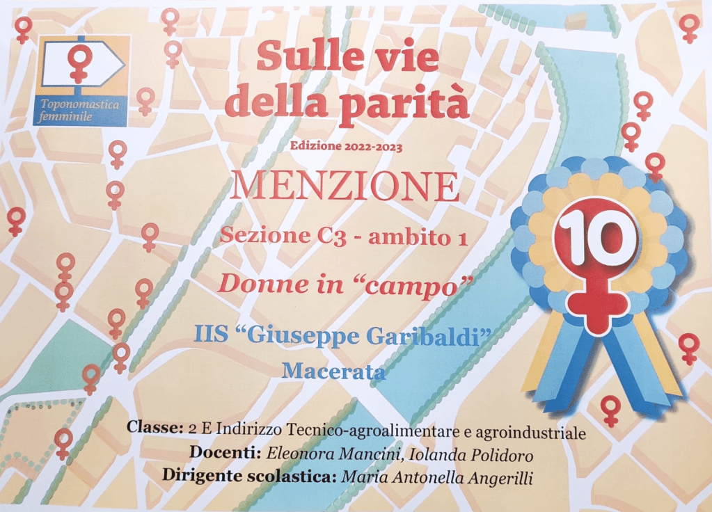 E quindi? E quindi, bando alle ciance, e veniamo a noi: il nostro racconto dalle Marche inizia dal progetto realizzato da uno degli istituti di istruzione superiore di eccellenza della provincia di Macerata; un istituto in cui innovazione fa rima con tradizione; un istituto all’avanguardia per offerta didattica e metodologie: al centro ci sono le/gli studenti e la ricerca continua di opportunità di crescita da offrire loro al di là di quella che è la vocazione professionalizzante della scuola. Stiamo parlando dell’Istituto di istruzione superiore “G. Garibaldi” di Macerata, una vecchia conoscenza di Sulle vie della parità nelle Marche, che si è aggiudicato il Primo premio ex aequo nell’ambito della Sezione B – Lavoro con il progetto Donne in “campo” realizzato dalla classe 2^E indirizzo tecnico-agroalimentare e agroindustria con la supervisione delle docenti Eleonora Mancini e Iolanda Polidori con la seguente motivazione: