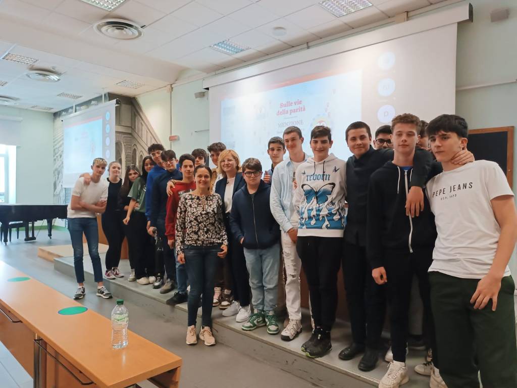 Un riconoscimento per questo interessante e articolato lavoro è arrivato anche nell’ambito del concorso nazionale. Il 27 aprile 2023, infatti, a Roma, nella premiazione del concorso nazionale, i ragazzi e le ragazze hanno ricevuto una Menzione di merito nell’ambito di Sulle vie della parità con la seguente motivazione: