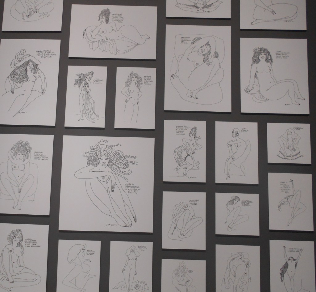 La didascalia ci spiega che molti di questi fanno parte del volume Nude e crude, dove «la rappresentazione della donna si fa ancora più intima e personale e i disegni più sperimentali ed espressionisti. (…) Altan sembra suggerire, come in altre occasioni, che il mondo retto dalle donne sarebbe comunque imperfetto, ma sicuramente migliore di quello che abbiamo». Questo un po’ ci consola e ci fa uscire dal palazzo e dalla bella esposizione con la gratitudine dovuta a un vero maestro, di arte come di vita.