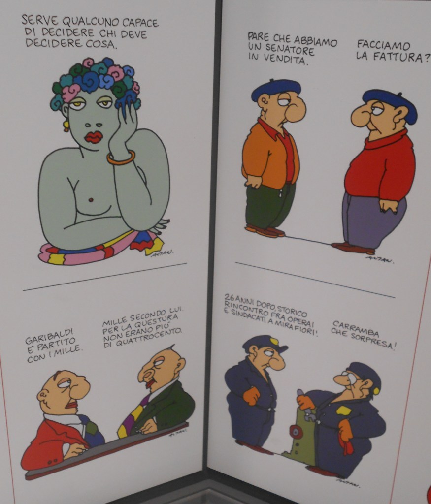 Proseguendo l’itinerario si arriva a un vasto ambiente arricchito da cartoni a grandezza naturale con i protagonisti della notissima serie dell’operaio Cipputi; incontriamo dunque i suoi compagni di lavoro, la coppia Ugo e Luisa, lo scettico Italo, il militante deluso chiamato Baschetto, lo spietato e avido riccone Deporcellis, un nome che è tutto un programma, il trucido Nando, il borghesuccio Mocassino fino a Omino, colui che nelle vignette più crudeli prende l’ombrello nel didietro… un vero spaccato della società, via via aggiornato e arricchito, fino all’attualità presente.