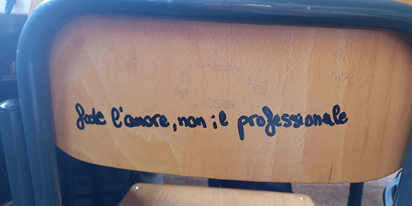 La frase che dà il titolo a questo articolo si legge a caratteri cubitali dietro lo schienale di impiallacciato sbriciolato di una sedia in seconda fila, nella mia quarta a indirizzo socio-sanitario. È in pennarello indelebile, nero, come si conviene a un pensiero di una certa profondità.