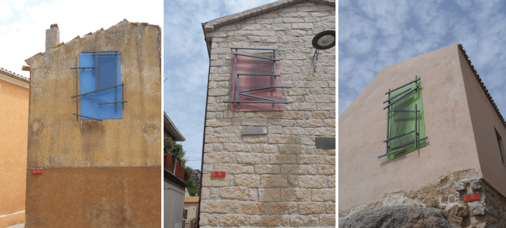 Si tratta di telai stilizzati, dai colori brillanti, in cui i fili di lana sono sostituiti, per durare nel tempo e all’aperto, da fili metallici, legandosi al tema della giornata e alla manualità femminile. Un esempio simile, ma realizzato con quei cartigli che hanno reso celebre Lai e che hanno lo scopo primario di “tessere memorie”, si trova all’interno del bel museo etnografico Meoc, dedicato a Oliva Carta Cannas, grazie alla donazione di alcune abitazioni e del terreno dagli eredi della donna, a sua volta abile tessitrice.