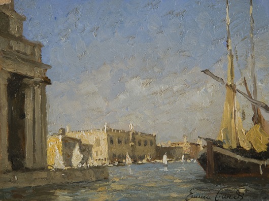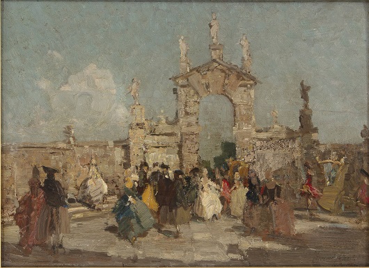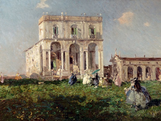 Non abbandona però mai le vedute della sua Venezia e della campagna trevigiana, che si fanno sempre più libere e sciolte, in un’interpretazione modernissima del vedutismo veneziano, e nemmeno le scene di genere neo settecentesche, temi particolarmente apprezzati dal pubblico inglese e americano. Le sue pennellate da macchie larghe si fanno più minute, a rendere una morbida fusione atmosferica.