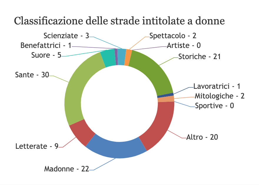 Benché in precedenza figure religiose, subalterne o legate a maternità e accudimento costituissero la totalità dei rari nomi designati e ora solo una porzione, in termini numerici, essi perdurano tenacemente al primo posto. In altre parole: le strade sono prima di tutto degli “angeli” siano essi dell’altare o del focolare. Questo è l’esempio ispiratore fornito alle donne che — nel quotidiano — le abitano, quelle strade. E se questo è tuttora coerente con il guscio pubblico, cosa significa per le bambine che crescono e per le donne che – in ogni fase della loro vita – camminano, per quelle strade, ogni giorno?