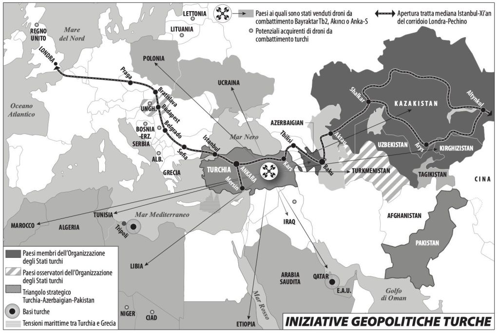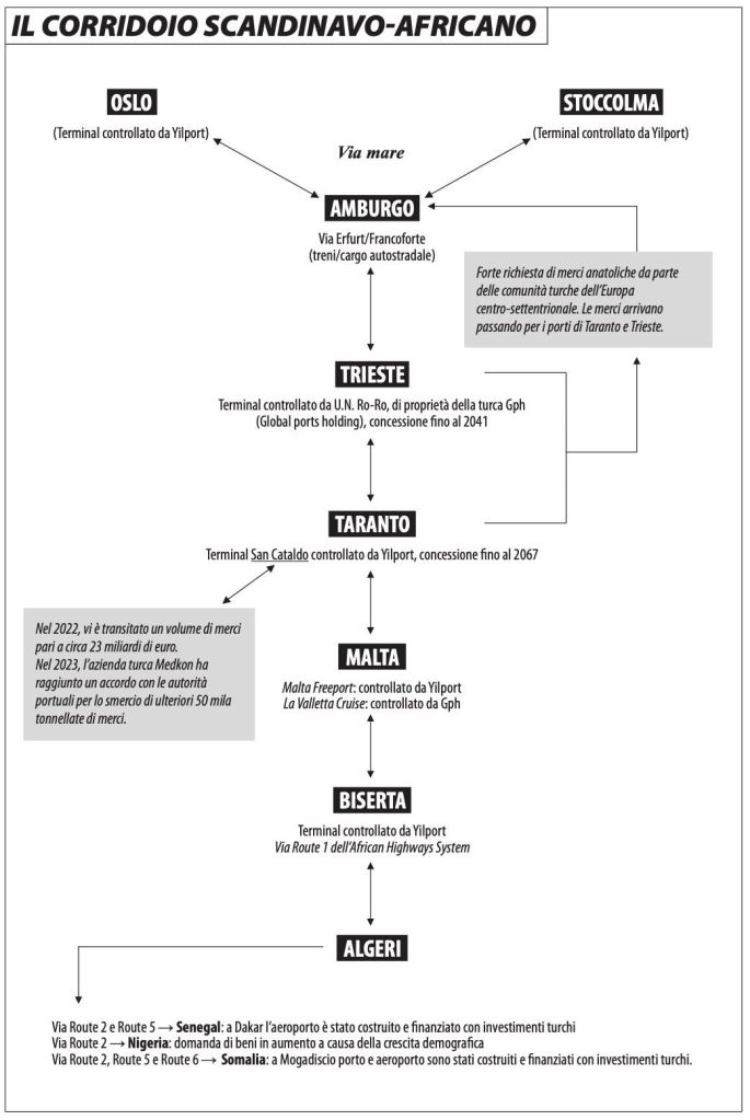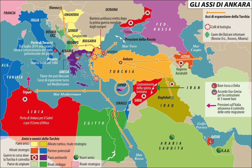 Da segnalare, in appendice al ricco e documentato editoriale del Direttore, Si prega di bussare alla porta, l’articolo di Giuseppe de Ruvo, La Turchia usa l’Italia per connettere Europa e Africa. Più di tante parole, su questo punto come sempre ci illuminano le carte dell’artista cartografa Laura Canali, che riportiamo.