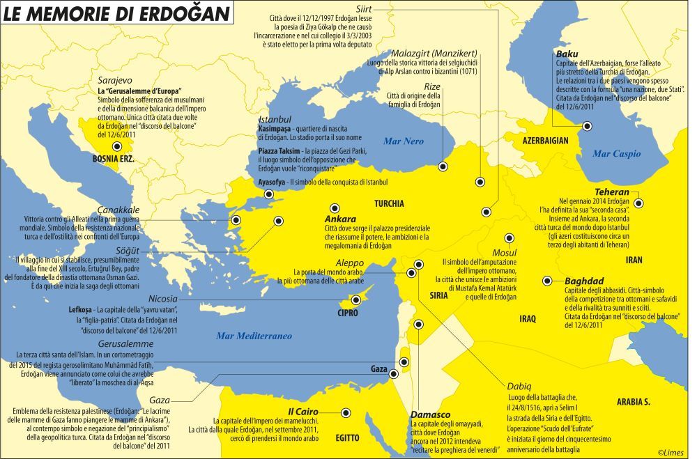 Nella prima parte della rivista è assolutamente da leggere Erdoğan figlio di Atatürk di Daniele Santoro, che ha anche curato questo numero di Limes. Ecco alcuni passaggi del saggio: «La Turchia è più grande della Turchia. I confini della Turchia vanno ben oltre i 780 mila chilometri quadrati. L’ostentazione della potenza, la ricerca della gloria, l’esibizione della (presunta) grandezza sono i tratti antropologici che contraddistinguono il capo turco. Recep Tayyip Erdoğan non (può) fa(re) eccezione. L’afflato imperiale di cui è permeata la narrazione del presidente turco da ormai due decenni è stato tramandato intatto per centinaia di generazioni».