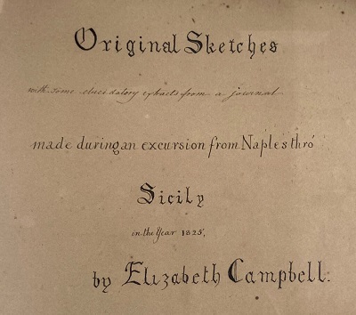 In Original Sketches di Elizabeth Campbell (1783-1861) le annotazioni sul suo viaggio sono accompagnate da vivaci acquarelli, che dimostrano il suo sincero interesse per la flora, la fauna, la storia, l’architettura, il popolo. Nel 1824 visitò il Lazio, dove dipinse il paesaggio di Nepi e il monte Soratte; salpò poi insieme a un gruppo di viaggiatori per Messina. Superarono Capri, Stromboli, Lipari e Scilla, per entrare nello Stretto di Messina. Sbarcati a terra, viaggiarono lungo la costa orientale a dorso di cavallo o mulo; oltre Taormina e l’Etna fino a Giardini, dove così commenta: «All’improvviso, mentre iniziavamo la discesa, ci apparve uno scenario di straordinaria bellezza, l’Etna svelata in piena maestà, Taormina in alto sulla scogliera vertiginosa, sotto il mare in calma maestà, il villaggio di Giardini, il tutto illuminato dai raggi brillanti di un sole al tramonto». Poi verso Catania e Augusta raggiunsero Siracusa, e da qui, passando per Agrigento e Sciacca, arrivarono a Selinunte. Nuovamente nell’entroterra, salirono ai templi di Segesta prima di scendere ad Alcamo e raggiungere Palermo.