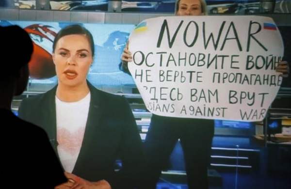 Marina Ovsyannikova, giornalista della Tv russa di stato ha coraggiosamente protestato in diretta. Nel programma di notizie serali, con milioni di telespettatori, è apparsa dietro la conduttrice portando un cartello su cui era scritto: Fermate la guerra, non credete alla propaganda, qui vi viene mentito. La sua protesta ha suscitato un enorme scalpore internazionale. Arrestata e multata è stata poi rilasciata. Ora vive in Ucraina.