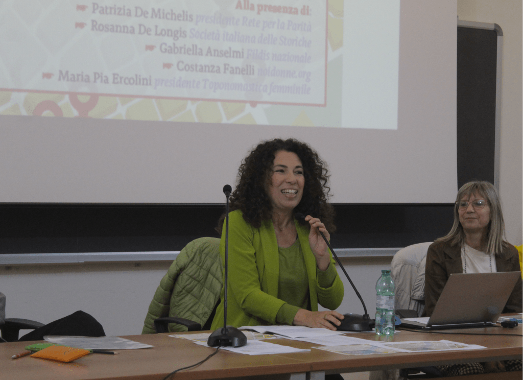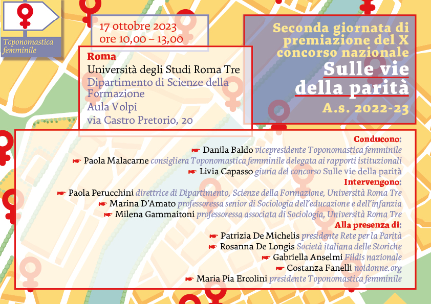 Danila Baldo, vicepresidente di Toponomastica femminile, Paola Malacarne e Livia Capasso hanno tenuto le fila della lunga mattinata. Hanno portato i saluti dell’Università la padrona di casa, professoressa Paola Perucchini, direttrice del Dipartimento, e Milena Gammaitoni, professoressa di Sociologia, preziosa amica di Tf. È intervenuta anche Marina D’Amato, professoressa onoraria di Sociologia dell’educazione e dell’infanzia. Hanno consegnato i premi rappresentanti dell’associazionismo femminile: Gabriella Anselmi di Fildis, Patrizia De Michelis della Rete per la parità, Rosanna De Longis della Sis-Società italiana delle storiche, Costanza Fanelli di Noi donne e Ilaria Canali, per la Rete nazionale donne in cammino.