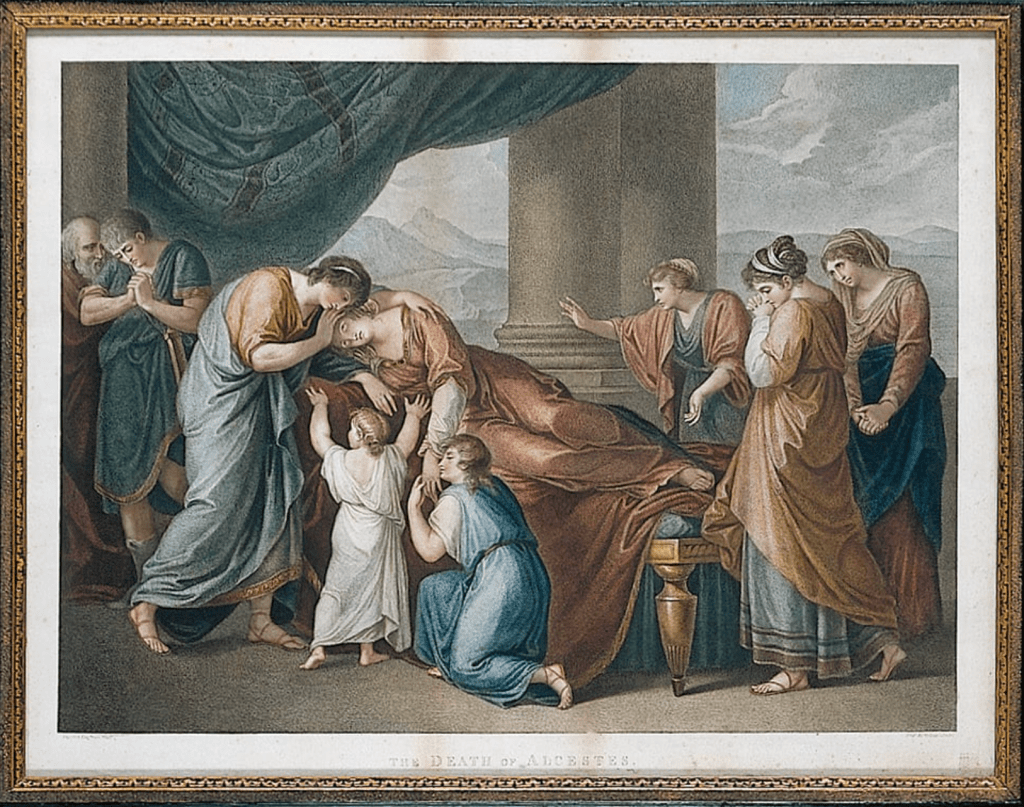 L’Alcesti fu rappresentata nel 438 come quarta e ultima pièce della giornata, occupando il posto di solito riservato a un dramma satiresco: un’opera leggera e a lieto fine, destinata ad allentare la tensione e disperdere le emozioni troppo forti suscitate dalle tre tragedie che l’avevano preceduta. Un po’ ci stupisce perché il tema della tragedia è la morte. Vi si racconta di Admeto, re di Fere in Tessaglia, cui viene concesso per intervento di Apollo, che vuole ricompensarlo della sua splendida ospitalità, di evitare la morte, se riesce a trovare qualcuno che prenda il suo posto nel regno degli Inferi. Gli anziani genitori rifiutano di sacrificarsi, mentre la giovane moglie Alcesti si offre volontariamente a Thanatos, la morte, che non vuole rinunciare alla sua preda, ma è disponibile allo scambio. Tutta la storia ce la racconta Apollo nel prologo, ognuno dei personaggi che si succedono in scena ha già fatto la sua scelta, ed espone le sue ragioni; al coro il compito di commentarle. E naturalmente si sprecano le lodi per Alcesti che per amore del marito, rinuncia perfino a veder crescere il figlio e la figlia. Lui, Admeto, è ovviamente disperato: come farà a vivere senza tale donna accanto? Si scaglia contro il vecchio padre che non ha voluto sacrificarsi per lui, ma quello ha buon gioco a rinfacciare il suo egoismo al figlio, che per non morire ha riversato la sventura sulla donna che dice di amare: tutti, afferma, amano per prima cosa la vita e tutti ne hanno una sola da vivere.