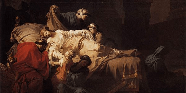 Il commiato di Alcesti dal mondo è pacato e sereno: solo, chiede al marito di non sostituirla con una donna peggiore di lei, temendo una cattiva matrigna il figlio e la figlia. Admeto decreta un anno di lutto in onore della moglie, ma si ripromette di osservarlo lui personalmente per tutta la vita; il coro afferma che «la regina vivrà nella gloria, perché è la più eccellente tra le donne che vivono sotto la luce del sole»; l’ancella ribadisce che «nessuna donna sarà in grado di superare colei che esprime la sua venerazione per il marito accettando di morire per lui», Alcesti, 150-155. Riferisce che l’ha vista piangere sul letto nuziale: «O letto, su di te un giorno sciolsi la mia veste di fanciulla e persi la verginità con l’uomo per il quale sto morendo. Sono venuta a dirti addio, perché non ti odio, anche se sono la tua unica vittima. Non ho avuto il coraggio di tradire te e il mio sposo, così ora lascio la vita. In futuro apparterrai a un’altra donna: lei sarà forse più fortunata di me, non certo più virtuosa». Ibidem, 177 – 182.