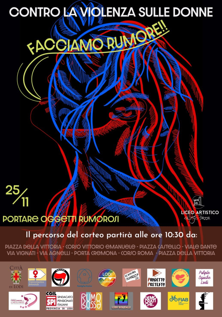 In Italia, il 25 novembre si svolgono moltissime manifestazioni nazionali contro la violenza sulle donne e di genere, promosse dalle associazioni e dai centri antiviolenza. Anche nella città di Lodi si svolgeranno importanti eventi per la Giornata, di cui una delle iniziative più significative sarà quella promossa dall’associazione Rumorossə. Il nome di questo gruppo è derivato dalla parola rumore, in quanto si propone di far sentire la voce di tutte e tutti, contro il pregiudizio e contro il silenzio, il peggior nemico delle donne. Per tale scopo, già l’anno scorso, l’associazione era stata promotrice del “corteo rumoroso” per le vie di Lodi, dove le/i partecipanti erano invitati a portare vari oggetti da usare come “strumenti” per fare più rumore possibile. Il corteo è poi terminato in piazza Castello, dove si svolgevano altre iniziative.