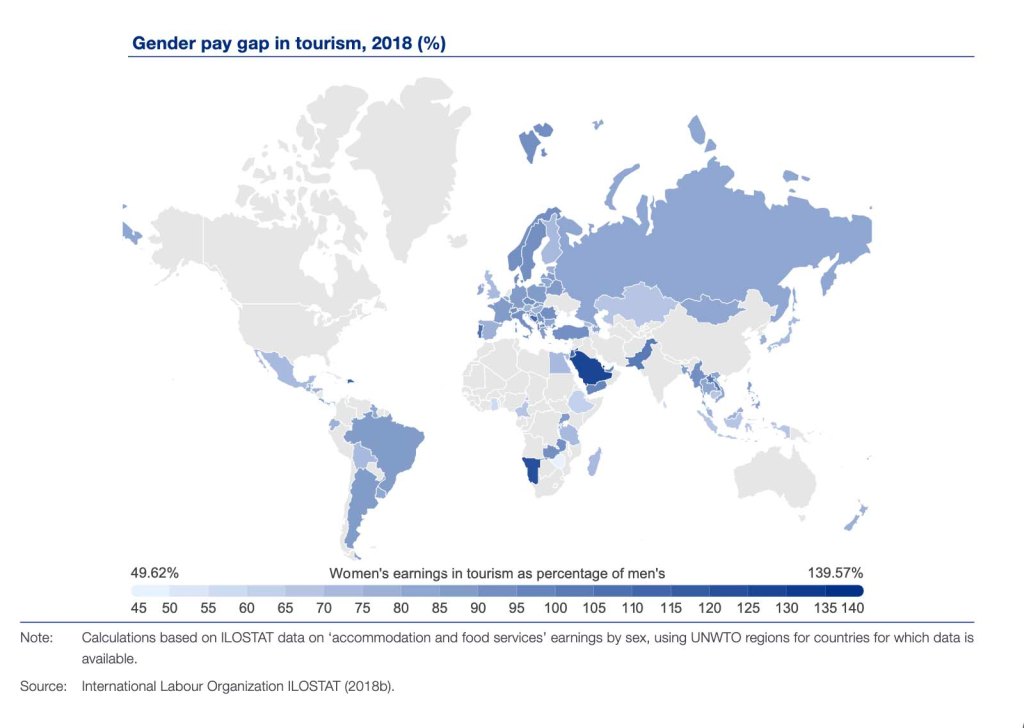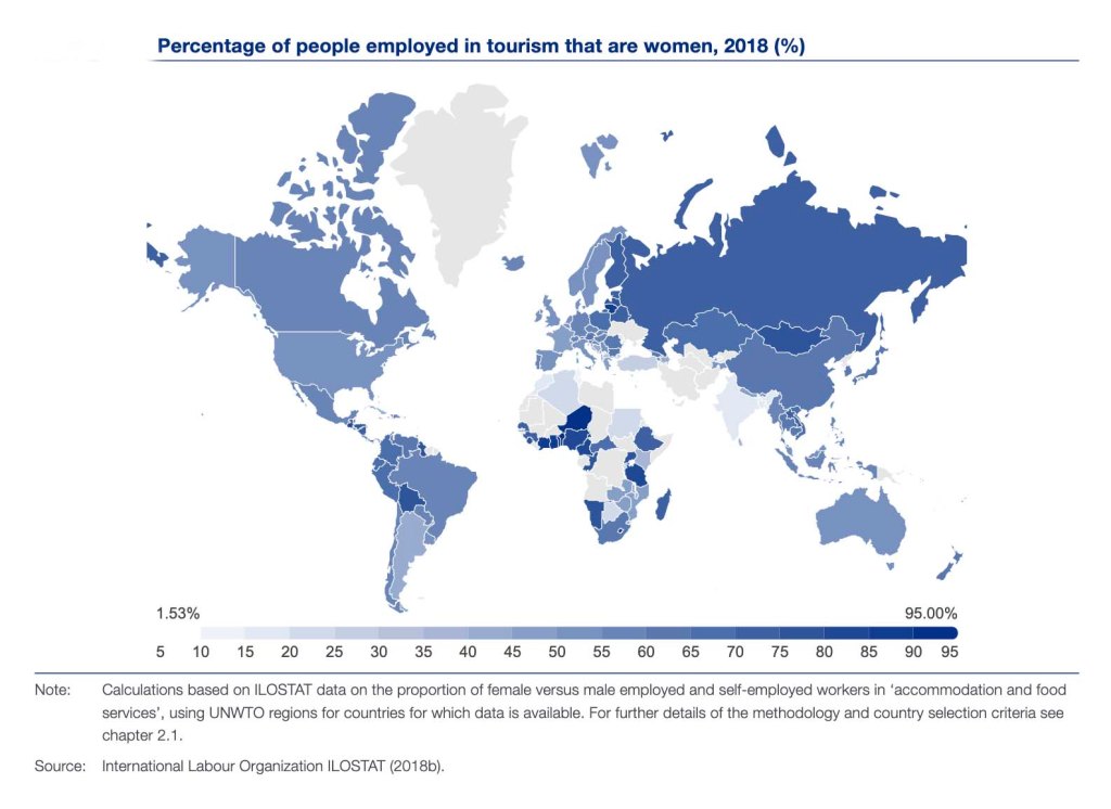 L’Unwto (United national world tourism organization) riporta che le donne costituiscono la maggioranza della forza lavoro turistica in tutto il mondo (54%) ma ricoprono posizioni di livello inferiore: per lo più possiedono e gestiscono attività proprie a scala ridotta, ma sono sottorappresentate nelle posizioni dirigenziali delle principali imprese turistiche.