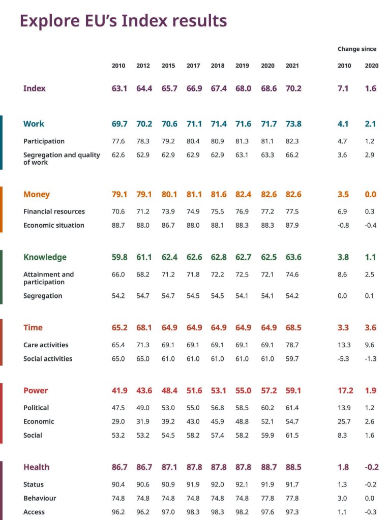 Chiudiamo questa prima parte dell’articolo con le parole di Carlien Scheele, direttrice dell’Eige: «Nel corso degli anni, l’Ue ha compiuto progressi verso l’uguaglianza di genere, ma siamo anche consapevoli che ciò non basta e che i progressi sono fragili. Oggi, solo la Svezia con un punteggio superiore a 80 punti nell’Indice si sta avvicinando sempre più all’uguaglianza di genere. La Svezia rappresenta solo circa il 2% della popolazione dell’Ue. Ci sarà sempre una scusa per sminuire l’importanza del lavoro sulla parità di genere. Non possiamo lasciare che ciò accada. Dobbiamo agire adesso. Insieme, a tutti i livelli. E dobbiamo celebrare le vittorie. Non importa il percorso. È ciò che ci farà procedere #3PassiAvanti».