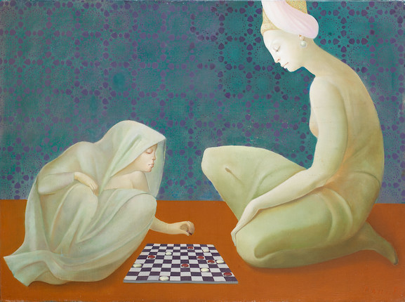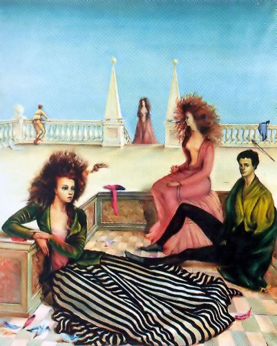 Il quadro di Leonor Fini “Personnages sur une terrasse” dipinto a Parigi nel 1938 ha sfiorato la cifra di un milione di dollari all’asta di Sotheby’s a New York il 29 giugno 2020. L’opera rientra a pieno titolo nel periodo surrealista di Leonor Fini. Il soggetto possiede decisamente caratteristiche oniriche: su una terrazza, su cui sono abbandonate delle calze e una scopa, accessorio tipico delle streghe, un uomo è seduto a destra e tre donne, vestite in modo da scoprire sapientemente il seno, dominano la scena. Sul fondo la scalinata è incorniciata da due piramidi sormontate da sfere. La donna a sinistra col suo cespuglio di capelli neri è Leonor: indossa un abito in perfetto stile Schiaparelli con camicetta rosa, lunga gonna di seta a righe e giacca di velluto verde.