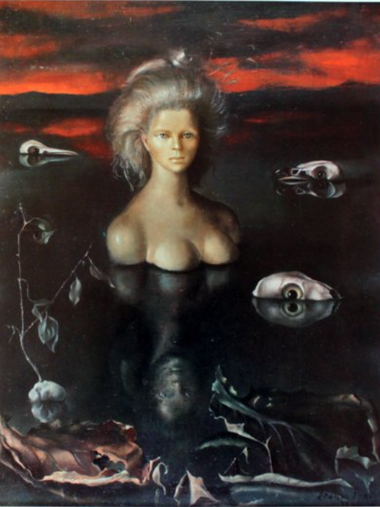 Ciò che la lega al Surrealismo è l’interesse per il mondo del fantastico e dell’inconscio, che trasforma la realtà quotidiana in visioni oniriche. In The Shepherdess of the Sphinxes (La pastorella delle sfingi) una donna forte, vigorosa, guida un gregge di sfingi ai suoi piedi, metà donne, metà leoni, che hanno appena consumato un pasto, di cui si intravedono i resti.