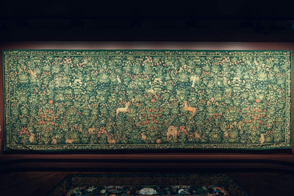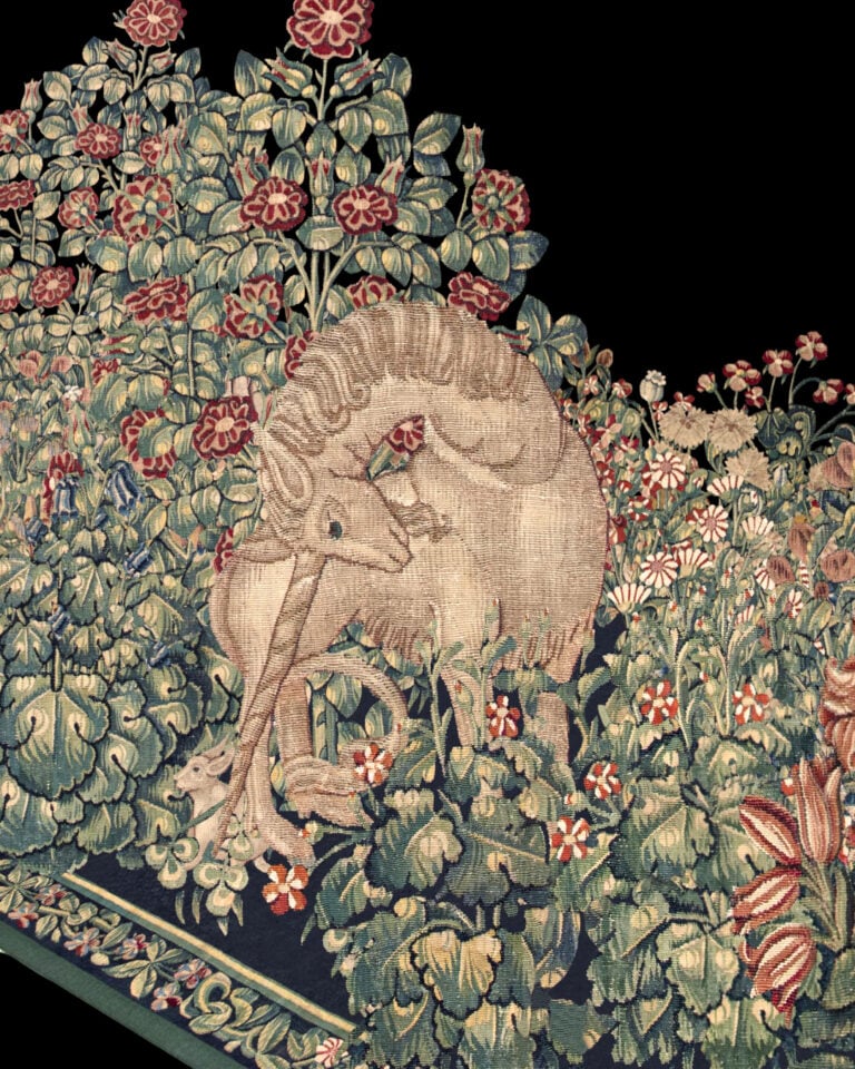 La prima storia che vogliamo raccontare riguarda un arazzo preziosissimo, detto “arazzo Millefiori”, al momento a Roma, alle Scuderie del Quirinale per la mostra Favoloso Calvino, fino al 24 febbraio 2024. Il manufatto, insuperabile opera di sapienti mani femminili, fu realizzato con seta e lana nelle Fiandre nel XVI secolo.