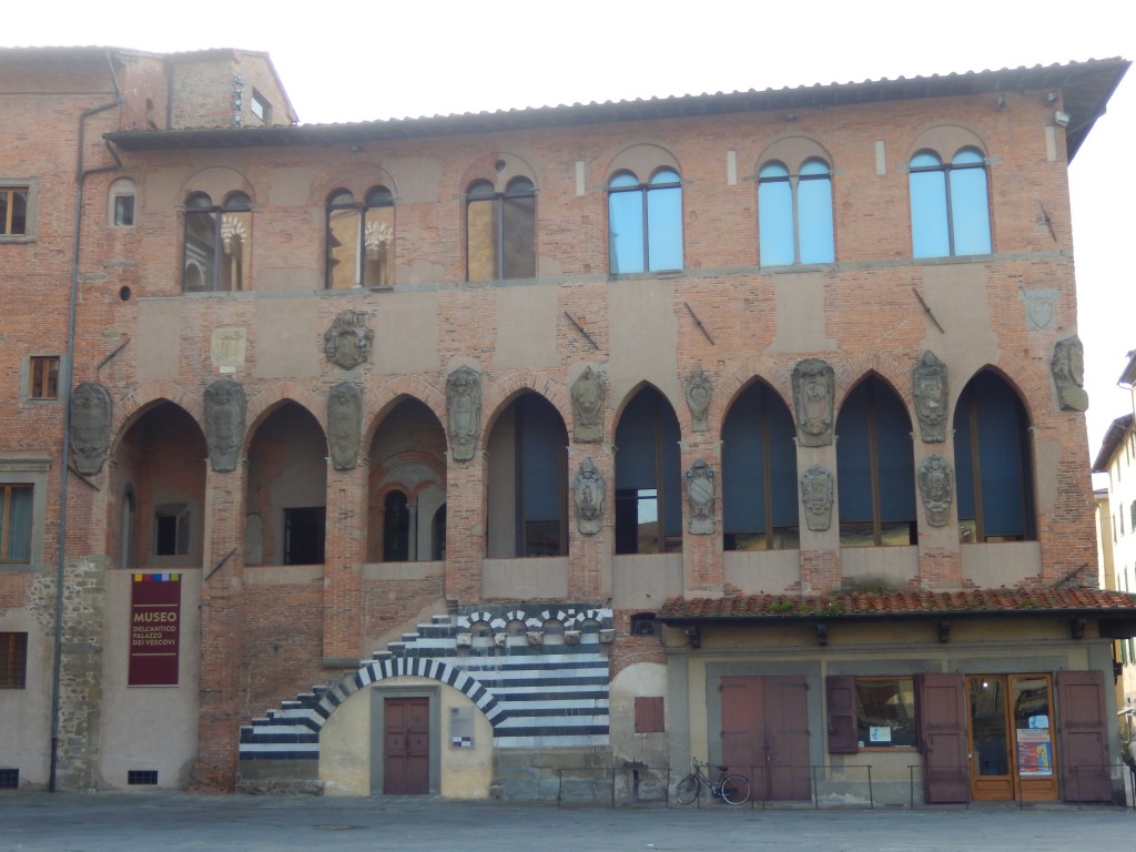 A Pistoia la bella piazza centrale dalla forma irregolare rappresenta un unicum nella topografia delle città medievali, infatti vi sono collocate tutte insieme le varie sedi del potere. Quello politico, quello ecclesiastico e quello giuridico sono rappresentati dalla Cattedrale di San Zeno, dal Battistero e dal Palazzo degli Anziani (o del Comune); di fianco sorgono poi l’Antico Palazzo dei Vescovi e il Palazzo di Giustizia. Qui inoltre si svolge da tempo immemorabile il mercato settimanale, perciò è davvero il cuore cittadino, il punto di incontro, il luogo degli scambi e degli affari. Il Palazzo dei Vescovi, risalente all’XI-XII secolo, fu rimaneggiato in seguito e abbellito con una scalinata e una loggia. Acquistato dalla Cassa di Risparmio ha subìto un attento restauro e ora è sede di un bellissimo museo, un vero scrigno di tesori di cui in buona parte sono state artefici le donne, e che donne!