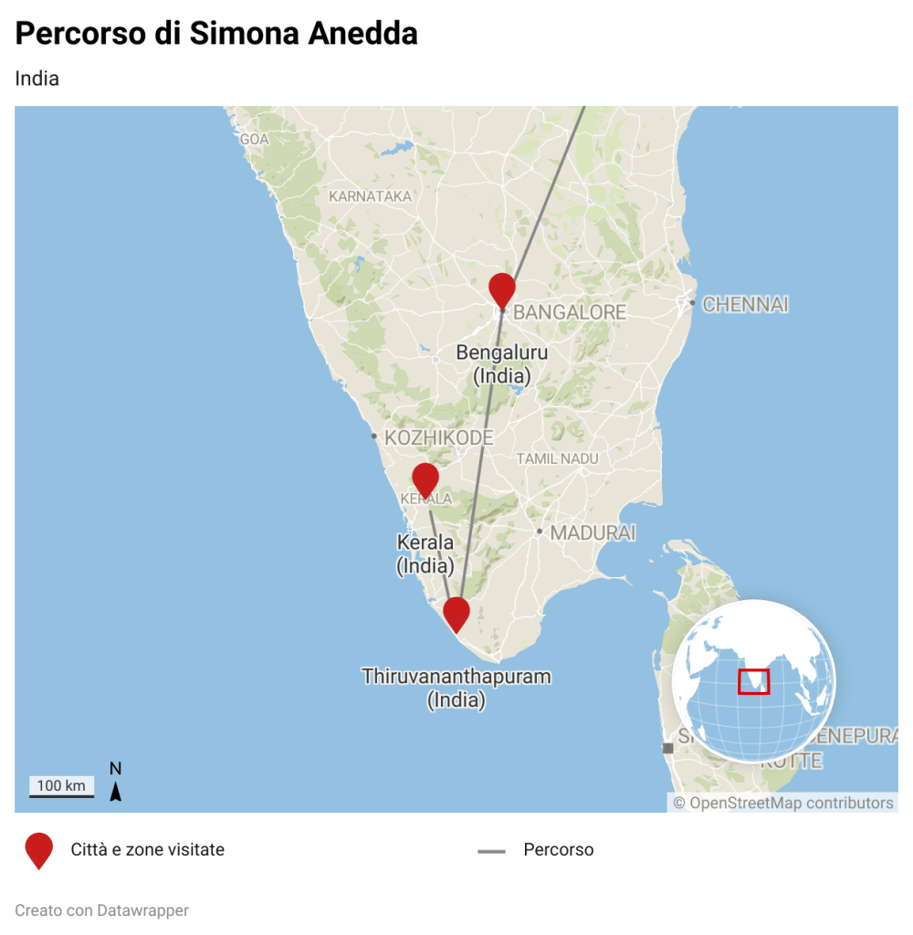 Da Varkala, dopo venti ore di treno, arriva a Bangalore, dove è stata ospite presso una congregazione, con la quale ha visitato le zone più povere della città ed è stata accolta nelle case e nelle chiese di chi, nonostante non avesse nulla, l’ha circondata con calore e generosità; divenendo un po’ un’attrazione per grandi e piccini con la sua sedia a rotelle tecnologica, ha potuto toccare con mano quanto la disabilità in India sia vissuta in un’altra maniera, costringendo gli individui a una vita ai margini della società, abbandonati a sé stessi e mendicando.