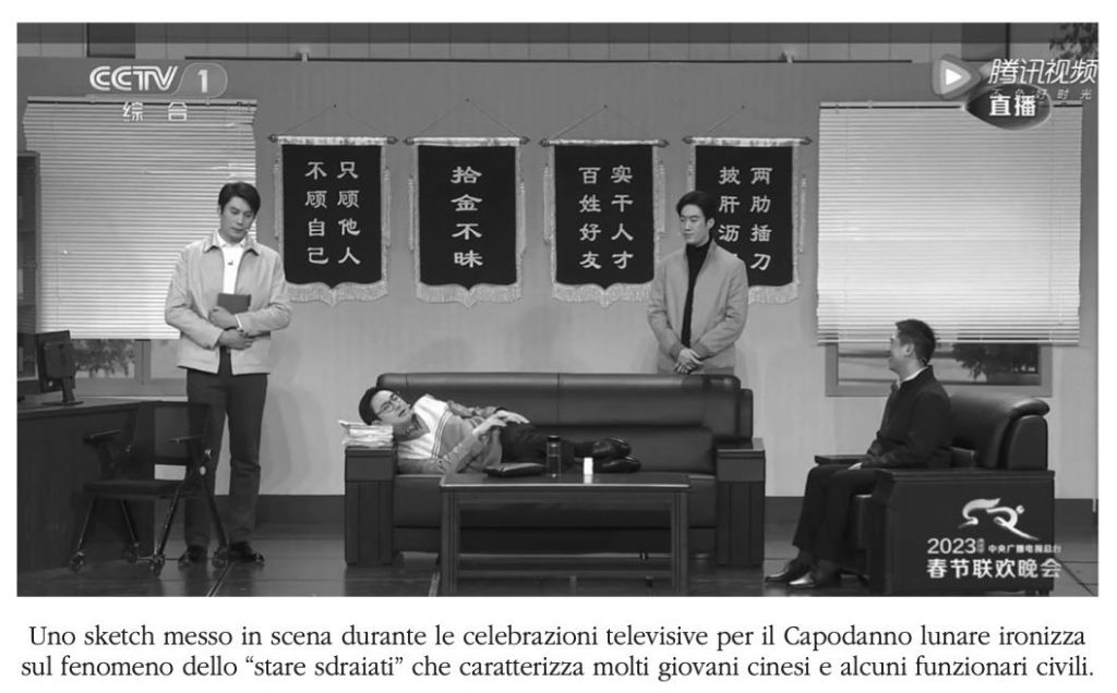 Col termine tangping, cioè «lo stare sdraiati», i Cinesi intendono la forma di reazione passiva alle delusioni dei giovani, anche di alcuni funzionari del Partito, determinate dalla società e dal percorso accademico e lavorativo. Facile il richiamo al libro Gli sdraiati di qualche anno fa di Michele Serra, a conferma che poi qualche punto in comune con una cultura che avvertiamo così lontana ce lo abbiamo. Durante le celebrazioni televisive per il Capodanno cinese, Pechino ha autorizzato la messa in onda di una parodia al riguardo.
