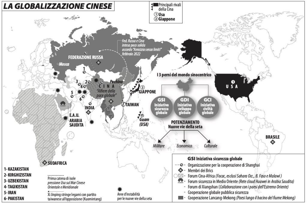 Xi l’insicuro sottolinea alcuni aspetti della personalità del leader più potente della storia della Repubblica popolare cinese, facendone intravedere alcuni aspetti che sfiorerebbero, secondo il giudizio di Zhao Suisheng, Professore e direttore del Center for China-US Cooperation alla Josef Korbel School of International Studies dell’Università di Denver, la paranoia. Per quanto riguarda la politica estera, Xi ha trasformato i diplomatici in “lupi guerrieri”. «Convinto dell’ascesa della Cina e della crisi del sistema a guida americana, Xi ha chiesto ai suoi diplomatici di operare con maggiore assertività. Secondo il presidente cinese, nell’attuale fase di transizione egemonica la diplomazia pechinese deve essere in grado di ‘assumere posizioni dure e di rispedire al mittente qualsiasi attacco’. Il vecchio adagio cinese secondo cui la diplomazia serve ‘a farsi nuovi amici e a trasformare i nemici in amici’ non è più valido. Peggio, è una debolezza. E le debolezze non sono più accettate». L’assertività di Pechino, che si è riavvicinata alla Russia, ha portato gli Stati Uniti e i loro alleati a intensificare il contenimento ai danni della Repubblica Popolare. La National Security Strategy della Casa Bianca pubblicata nell’ottobre 2022 indica come principale obiettivo geopolitico degli Usa «vincere la competizione con la Cina» («out-competing China») Alla Repubblica Popolare Cinese (Rpc) sono attribuite l’intenzione e la capacità (economica, diplomatica, militare e tecnologica) di riconfigurare l’ordine internazionale a proprio favore. Gli Usa contrappongono alla democrazia, di cui sarebbero i portavoce nel mondo, l’autocrazia cinese e russa. Dal canto suo, Xi Jinping ritiene che – attraverso strumenti come il Quad(Il Dialogo quadrilaterale di sicurezza ,Quadrilateral Security Dialogue, alleanza strategica informale tra Australia, Giappone, India e Stati Uniti con lo scopo di contenere l’espansionismo cinese nella regione dell’Indo-Pacifico) e l’Aukus, (un patto di sicurezza trilaterale, firmato nel 2021 tra Australia, Usa e Gran Bretagna) – le potenze occidentali stiano tentando di accerchiare la Cina, con l’obiettivo finale di strangolarla. Per questo Xi Jinping si sente continuamente minacciato e non accetta critiche. Insomma, leggere questi approfondimenti accanto a quelli della seconda parte in cui si analizzano le manovre difensive degli Stati amici degli Usa nei confronti di Russia e Cina, fa pensare a quanto insicuri siano non solo Xi-Jinping e i cinesi ma anche i loro avversari e quanto sia facile, per gli uni e per gli altri, ipotizzare una guerra.