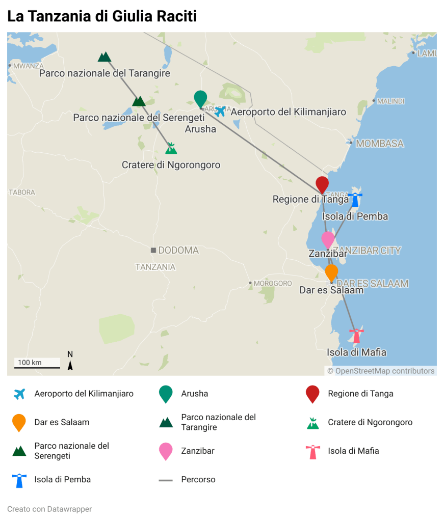 Un viaggio che ne contiene tanti altri, un’esplosione di colori che finisce simbolicamente nelle spiagge dell’Oceano Indiano e nelle sue acque piene di vita da spiare. Il saluto di Giulia è: «Karibu Tanzania!», che vuol dire «Benvenute in Tanzania!». Allora forse il viaggio comincia adesso.