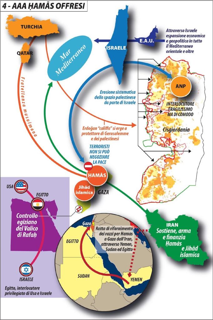 Tra i tanti contributi da segnalare il saggio della storica e saggista Paola Caridi, grande conoscitrice ed esperta delle vicende palestinesi, autrice del libro Hamas, edito da Feltrinelli. Se ne riportano alcuni passaggi fondamentali per la conoscenza di questa organizzazione. Partendo dall’analisi del video trasmesso il 7 ottobre 2023, immediatamente dopo l’attacco a Israele eseguito dalle Brigate ‘Izz al-Dīn al-Qassām, Caridi ci introduce alla figura di Muḥammad Ḍayf, capo dell’ala militare di Ḥamas di cui circola solo una vecchia foto, che è sempre stato ritratto come una sagoma scura, nera. Nel video Dayf si assume l’intera responsabilità dell’azione militare a sorpresa, in ciò confermando la prevalenza in questa operazione dell’ala militare di Hamas su quella politica, ribadita anche in un’intervista del New Yorker da Abū Marzūq, capo dell’Ufficio politico del gruppo terroristico fino agli anni Novanta. Marzuq, dopo essere stato arrestato e liberato dalle autorità americane, ha scelto di diventare l’ideologo e l’uomo delle trattative, lasciando la guida del gruppo, a cui nel tempo si sono unite anche altre forze, ben descritte nell’approfondimento L’arcipelago delle milizie palestinesi a cura di Umberto De Giovannangeli.