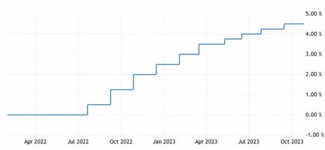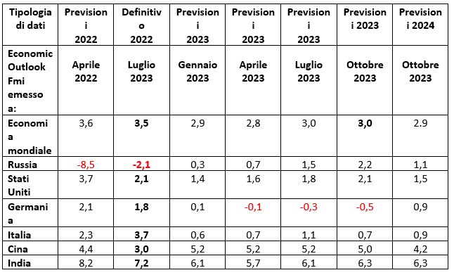 L’economia dell’Eurozona è sull’orlo di una possibile recessione. Ci si è arrivati/e in primis a causa dell’attività speculativa sul gas sul mercato TTF di Amsterdam, fin dal giugno 2021, e poi per la successiva «scellerata decisione dei Paesi europei di assecondare le richieste di Washington riguardanti l’applicazione delle sanzioni alla Russia a partire addirittura dal giorno antecedente l’inizio dell’operazione militare speciale russa, e, infine, a causa del Piano REPowerEu del maggio successivo, con il quale abbiamo rinunciato al conveniente gas proveniente via tubo dalla Russia» (Andrea Vento, Economia di guerra parte VII). L’aumento del costo del denaro per famiglie (prestiti al consumo e mutui) e imprese (investimenti produttivi), insieme alla flessione dei consumi dovuta alla riduzione dei salari reali ha generato una contrazione della domanda aggregata sfociata, come aveva previsto il Fmi, in un marcato rallentamento economico (grafico 3). Le undici tranche di sanzioni ai danni di Mosca, cui sta per aggiungersene una dodicesima, alla fine hanno impattato maggiormente sulle economie dei Paesi europei. L’Outlook del Fmi di ottobre prevede per l’Europa una situazione ai limiti della stagnazione (tabella 1).